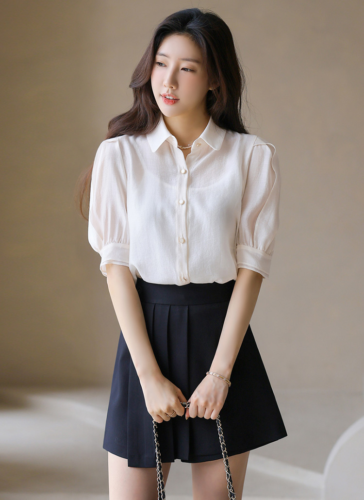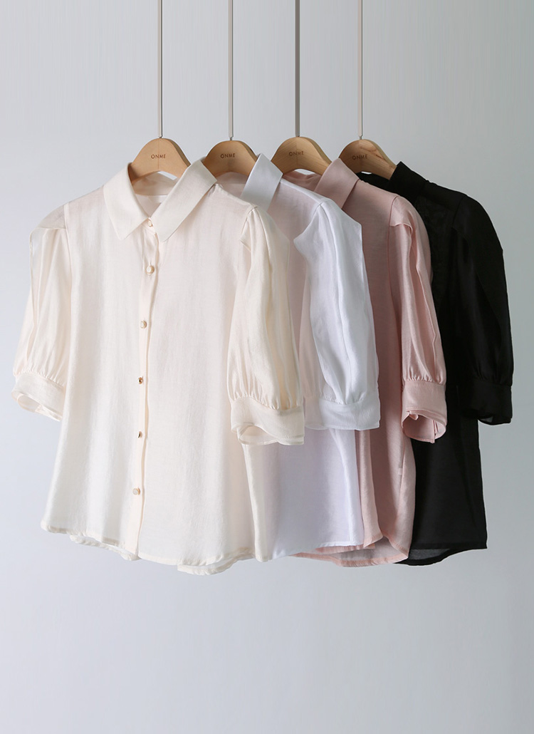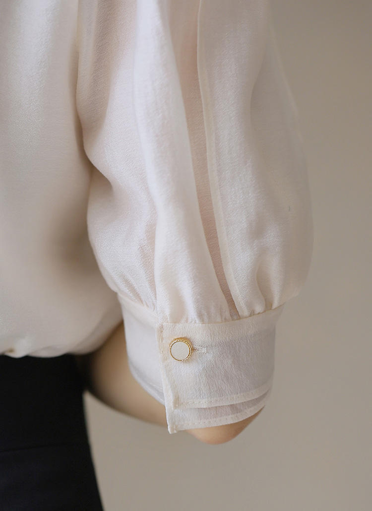 [Elegant tencel-blend blouse featuring romantic puff sleeves and subtle sheen. Gold-rimmed jewel buttons add sophisticated charm to any outfit.]