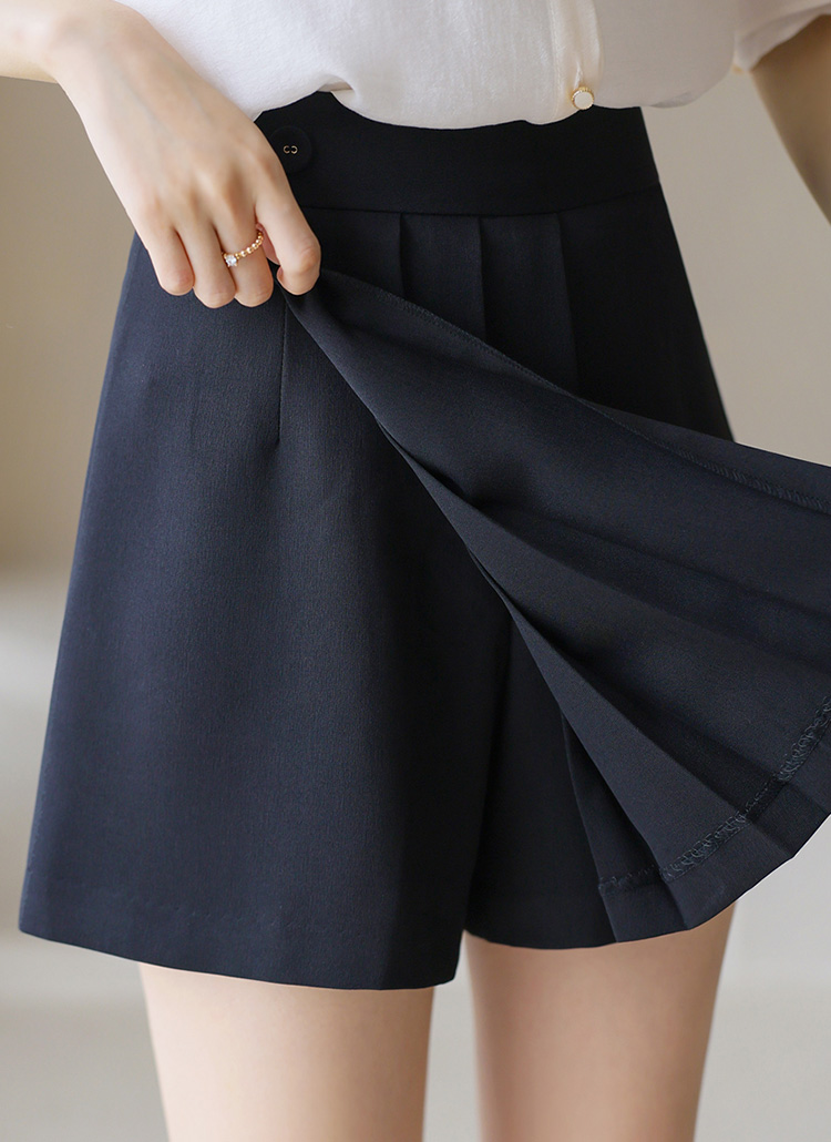 [Sophisticated skort combining skirt elegance with shorts comfort. Features front pleats and decorative button accent for versatile professional styling.]