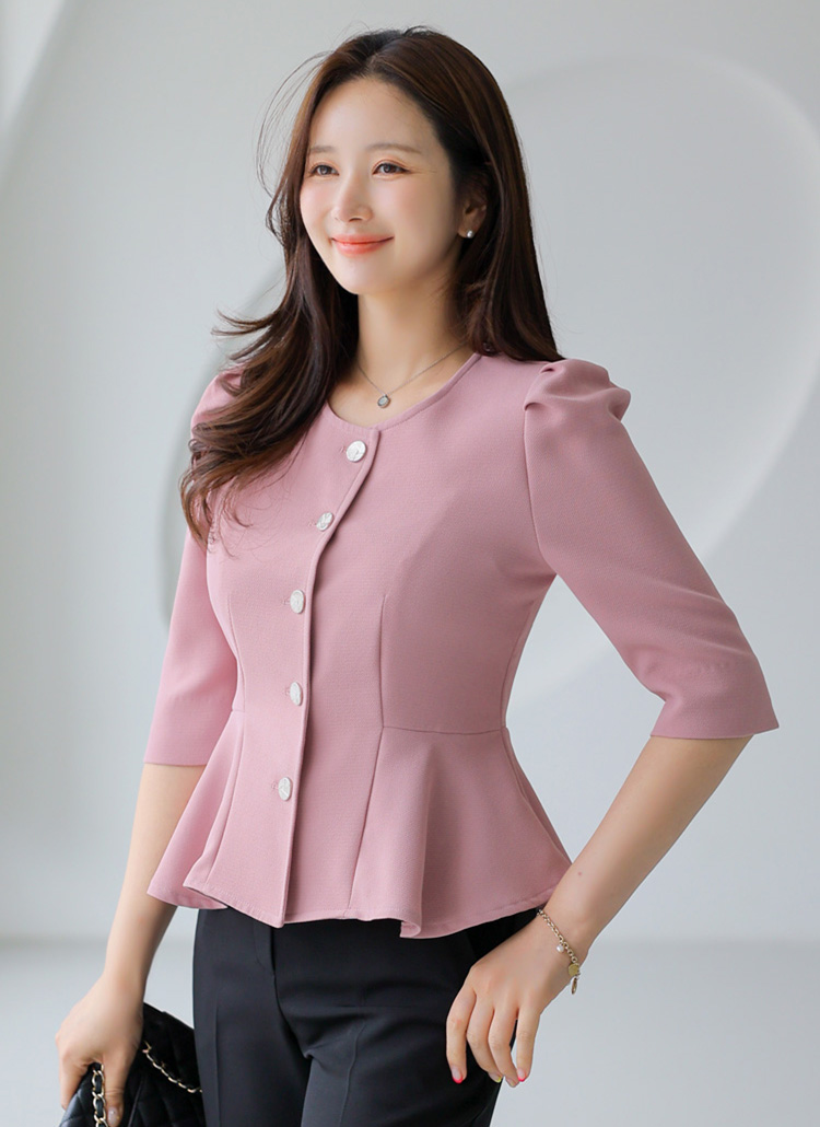 잘록한 허리라인과 밑단 셔링 페플럼으로 사랑스러운 실루엣을 완성하는 블라우스에요 :)