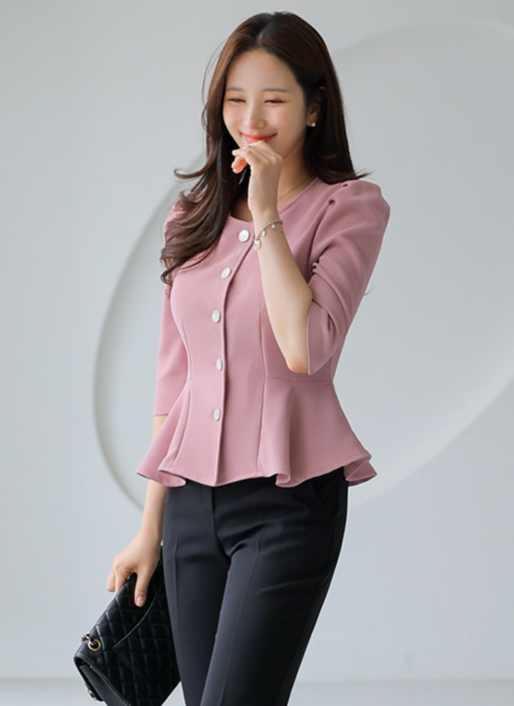 잘록한 허리라인과 밑단 셔링 페플럼으로 사랑스러운 실루엣을 완성하는 블라우스에요 :)