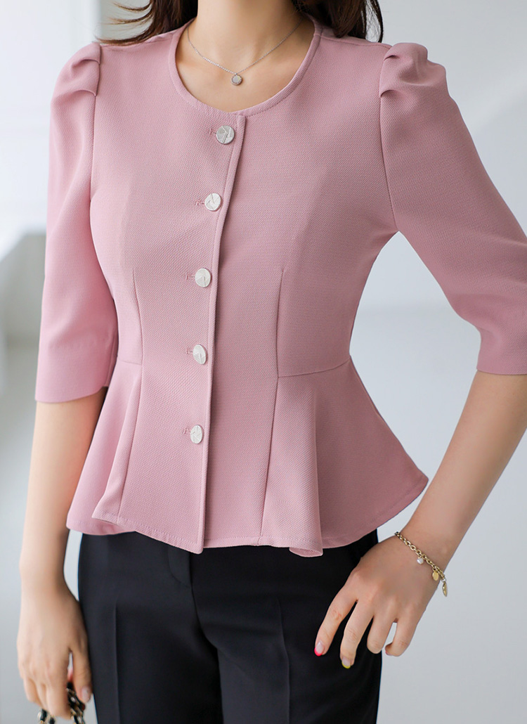 [Flattering peplum hem and tailored waist create a feminine silhouette—perfect for office days or elegant outings in warm seasons.]