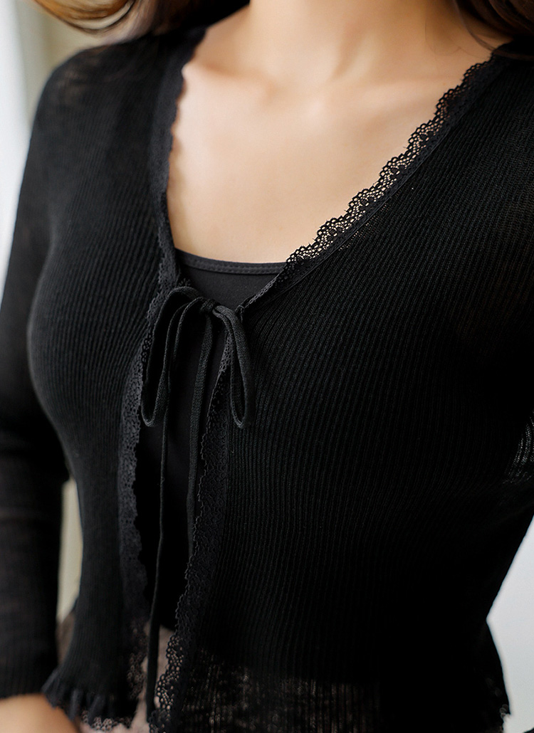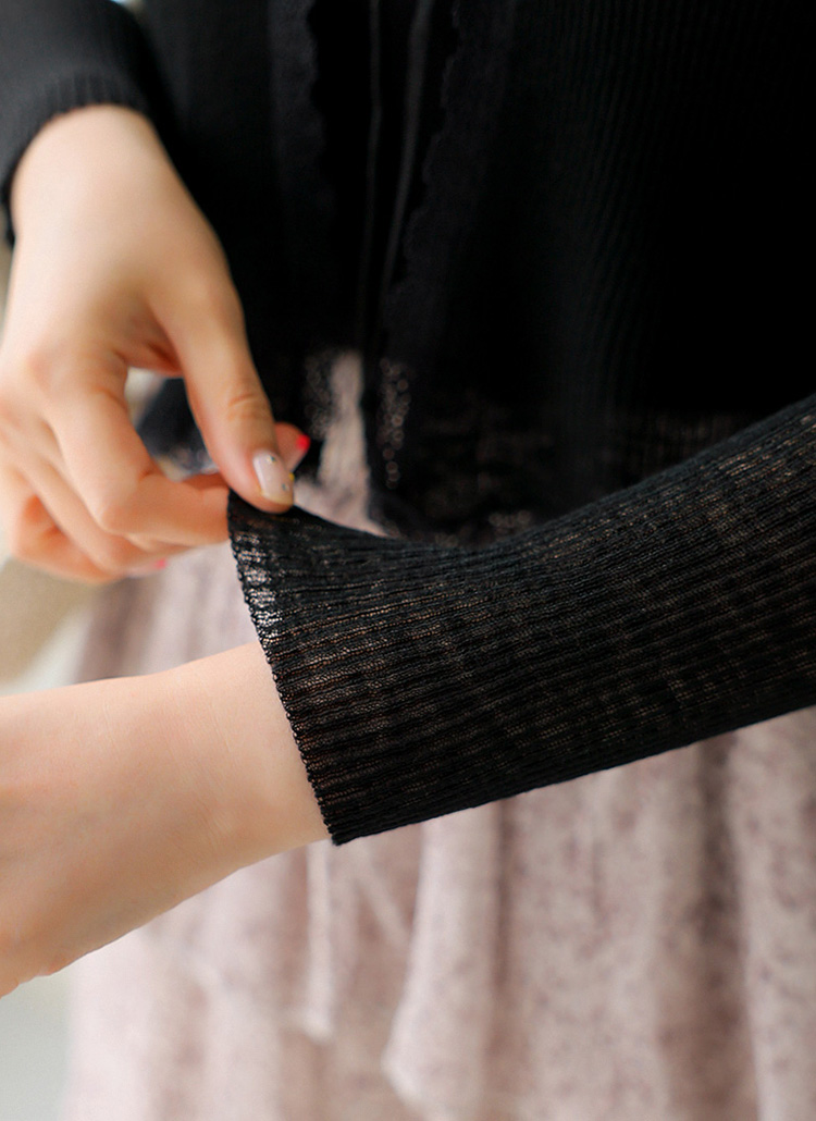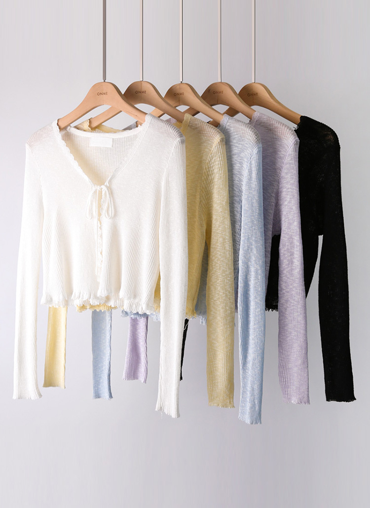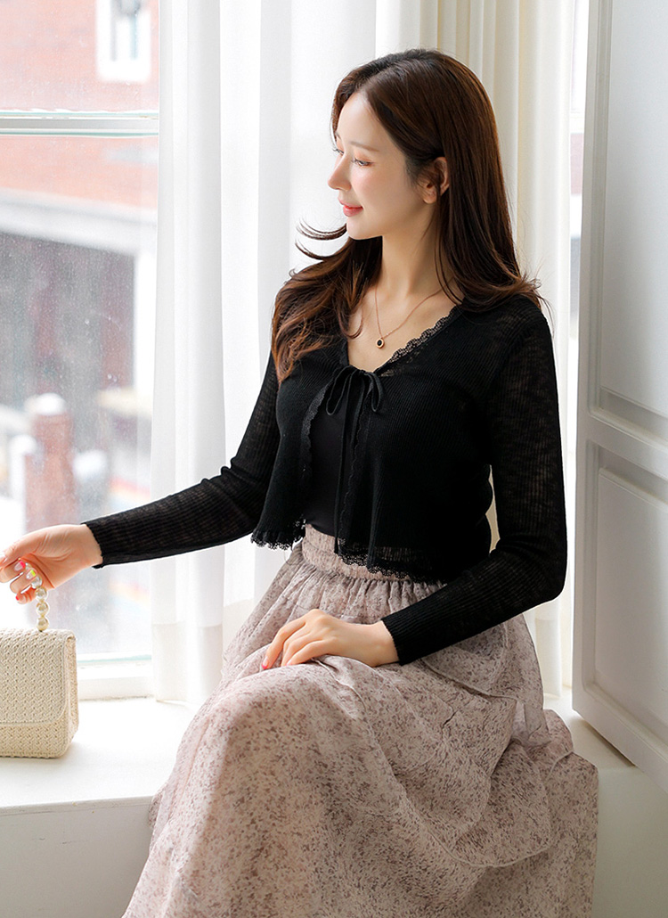 [Delicate slub knit meets a scallop lace hem and dainty ribbon tie—perfect as a soft layer for sun coverage or light indoor warmth.]