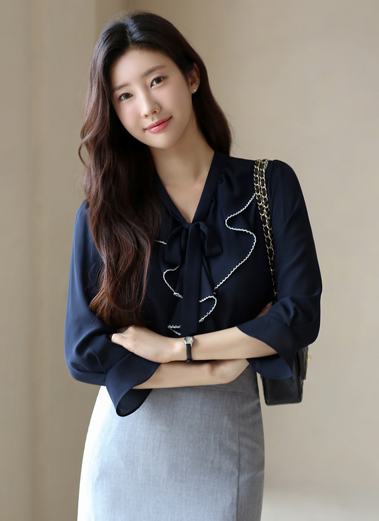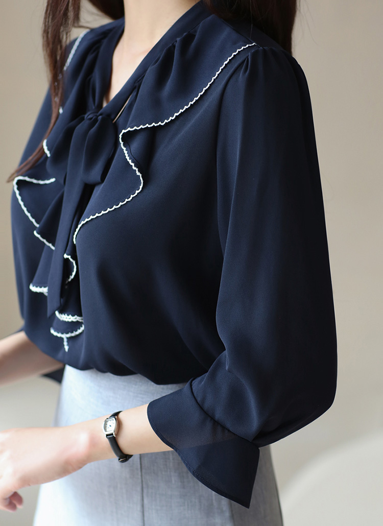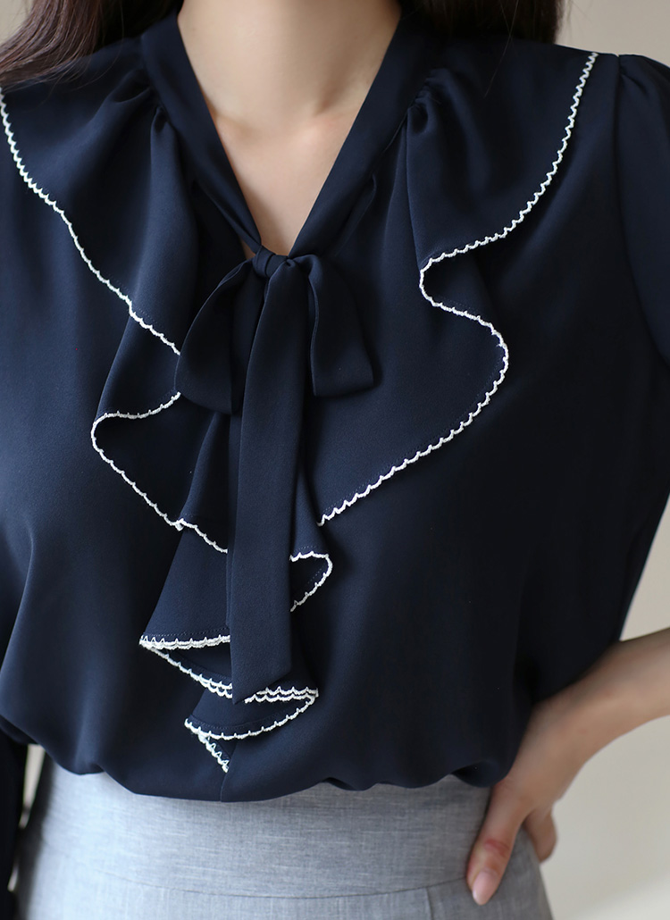[Elegant blouse with contrast ruffle trim and a tie-neck detail, finished with ¾ flare sleeves for a graceful silhouette.]