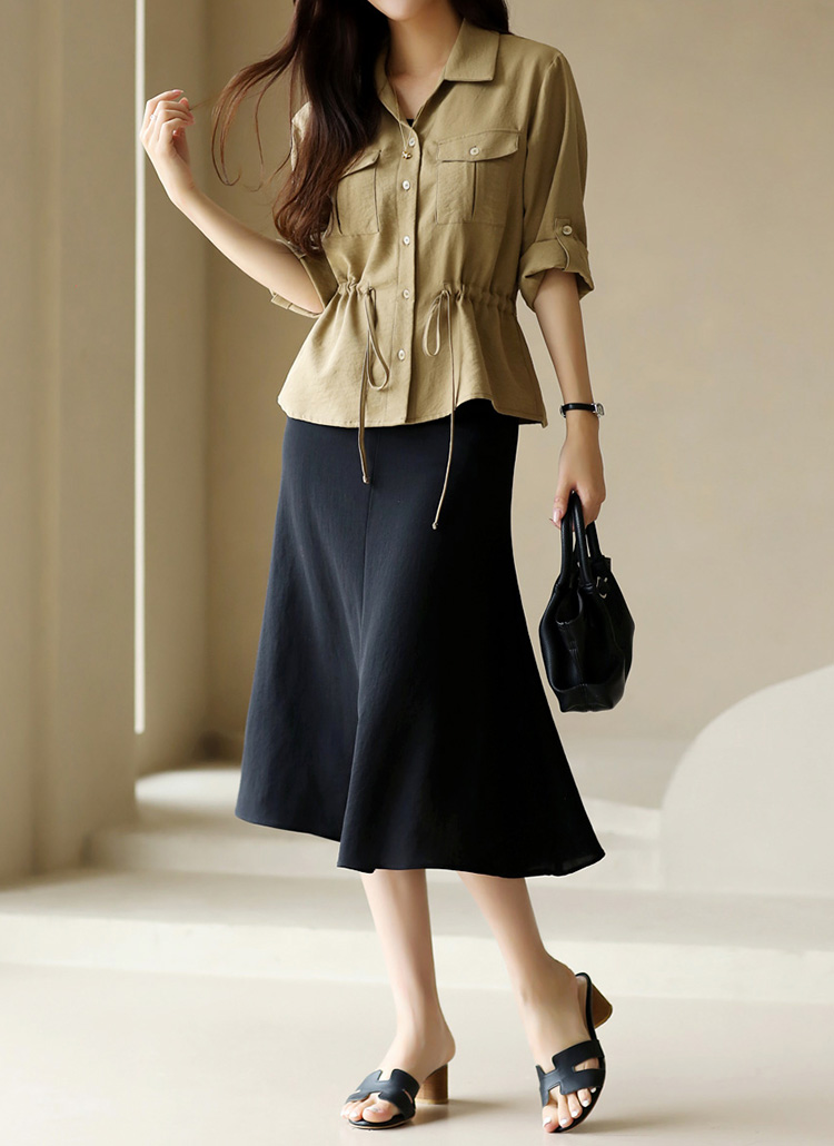 [Featuring roll-up sleeves and a cinched waist, this blouse flatters your figure while offering versatility for everyday styling.]