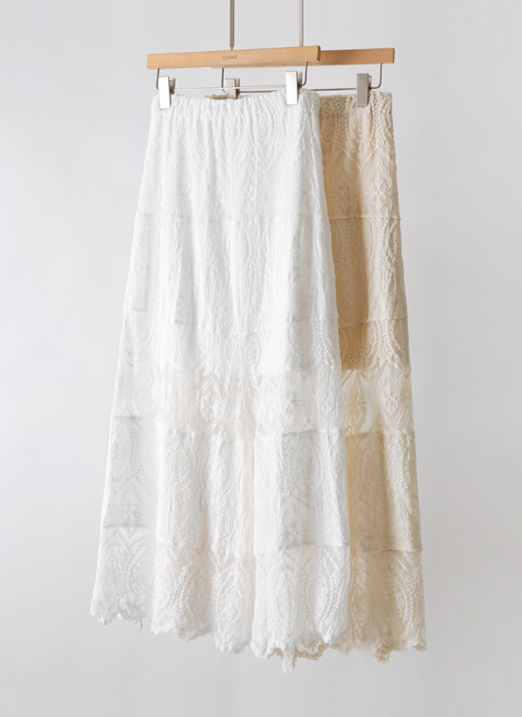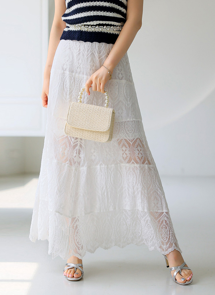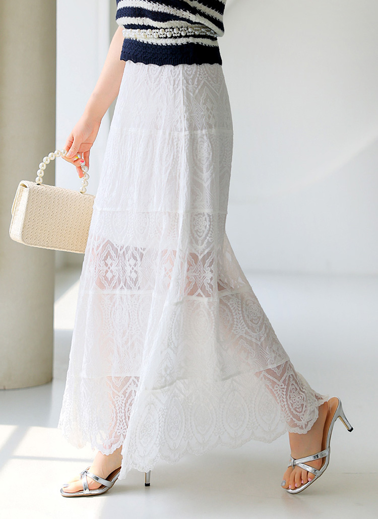 [Elegant tiers of sheer embroidered lace, stretch waist and scalloped hem create a flowing A-line silhouette with a soft, feminine touch and vacation-ready charm.]