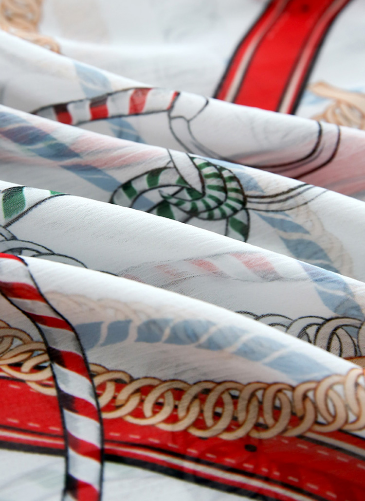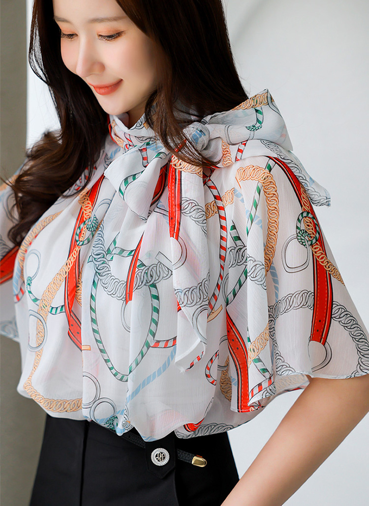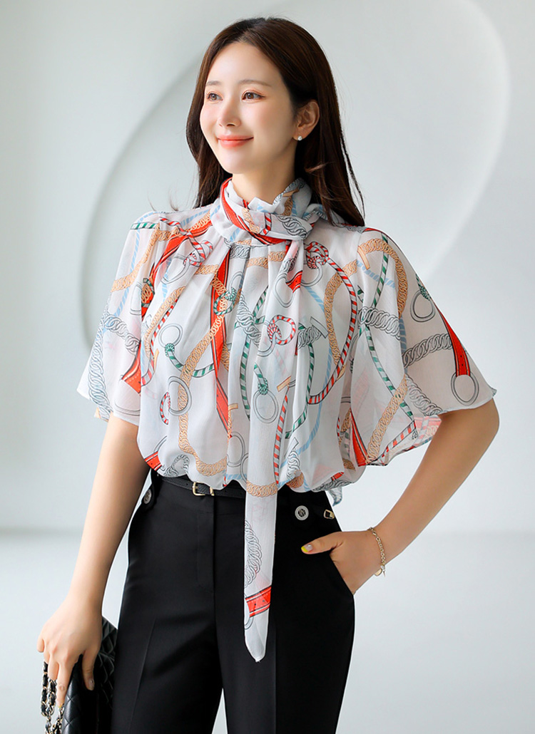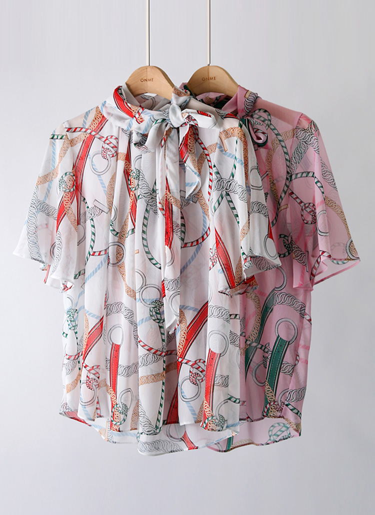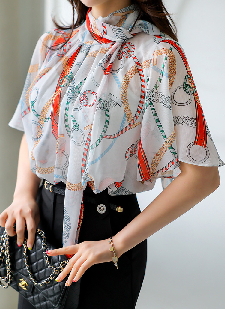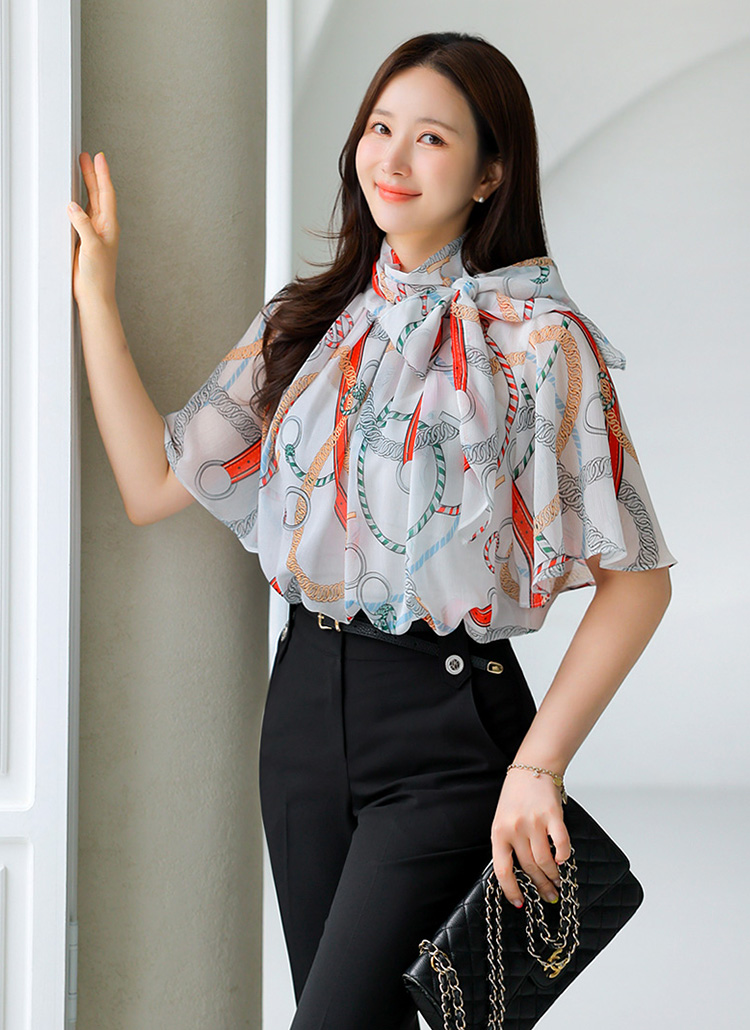 [Lightweight chiffon blouse with a bold chain print, flutter sleeves, and a tie-neck you can style as a ribbon or scarf.]