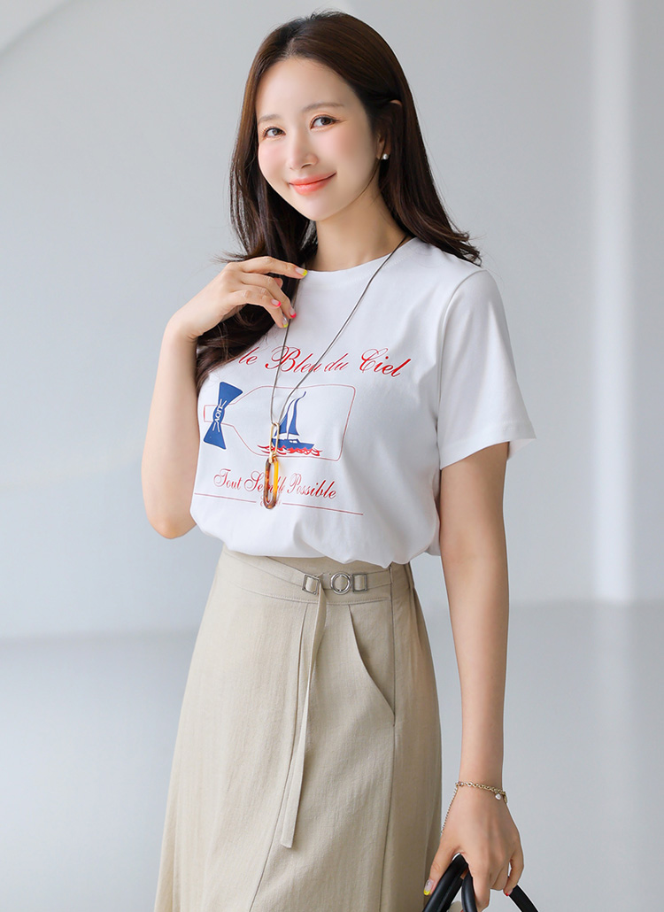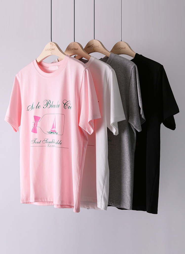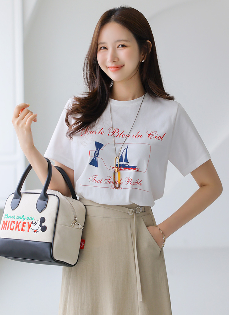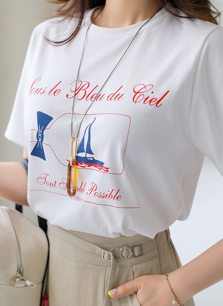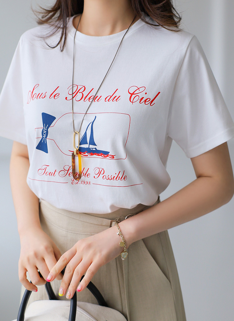 [A playful sailboat-in-a-bottle print with ribbon and French lettering makes this tee an easy standout in everyday looks.]