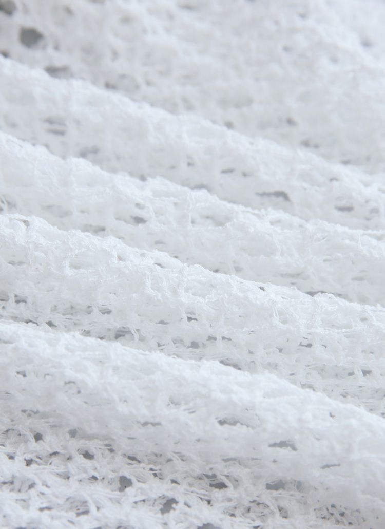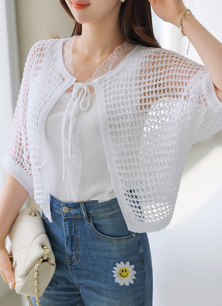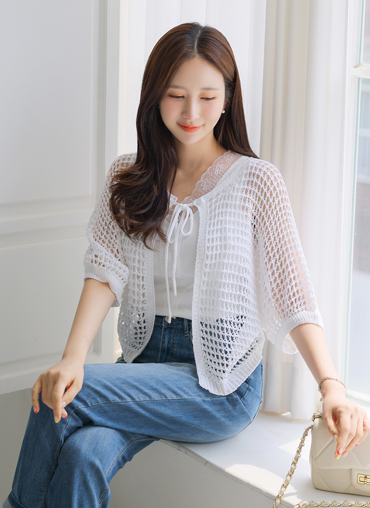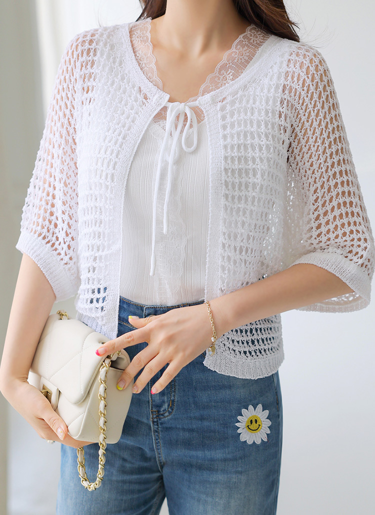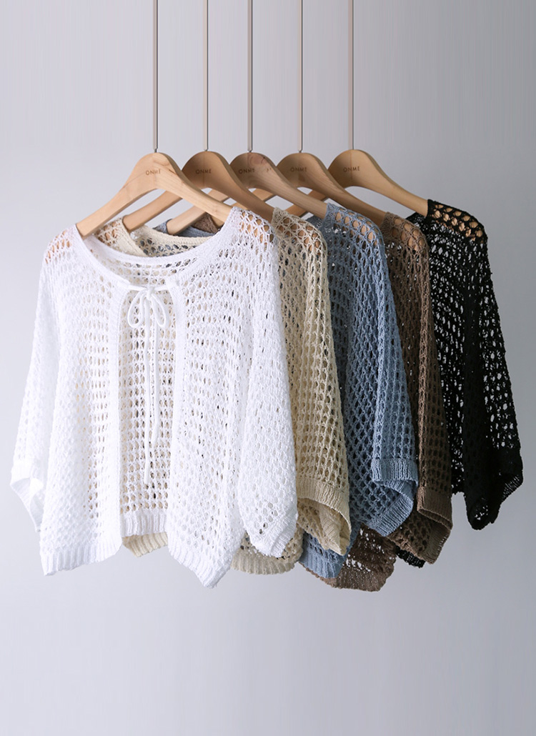 [Stay cool in this airy mesh-knit bolero with front tie closure—lightweight, stretchy, and easy to layer over any look.]