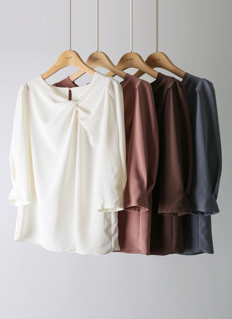 넥 라인에 들어간 꼬임 디테일이 입체적이고 볼륨감 있는 실루엣을 연출해주며