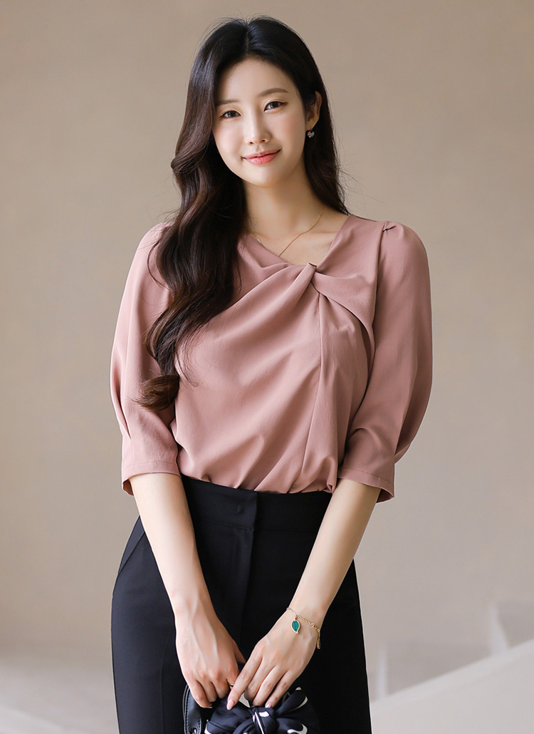 [Soft satin fabric and a twist-front neckline combine with puff sleeves for a graceful, flattering blouse perfect for any occasion.]