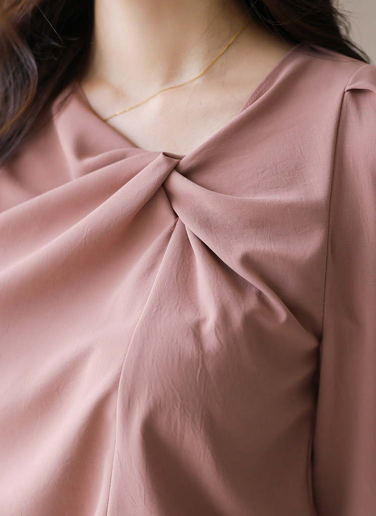 넥 라인에 들어간 꼬임 디테일이 입체적이고 볼륨감 있는 실루엣을 연출해주며