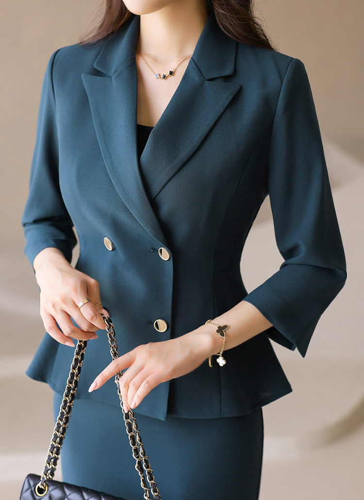[Slim-fit blazer with gold-tone double buttons and a feminine peplum hem for an elegant silhouette and flattering proportions.]