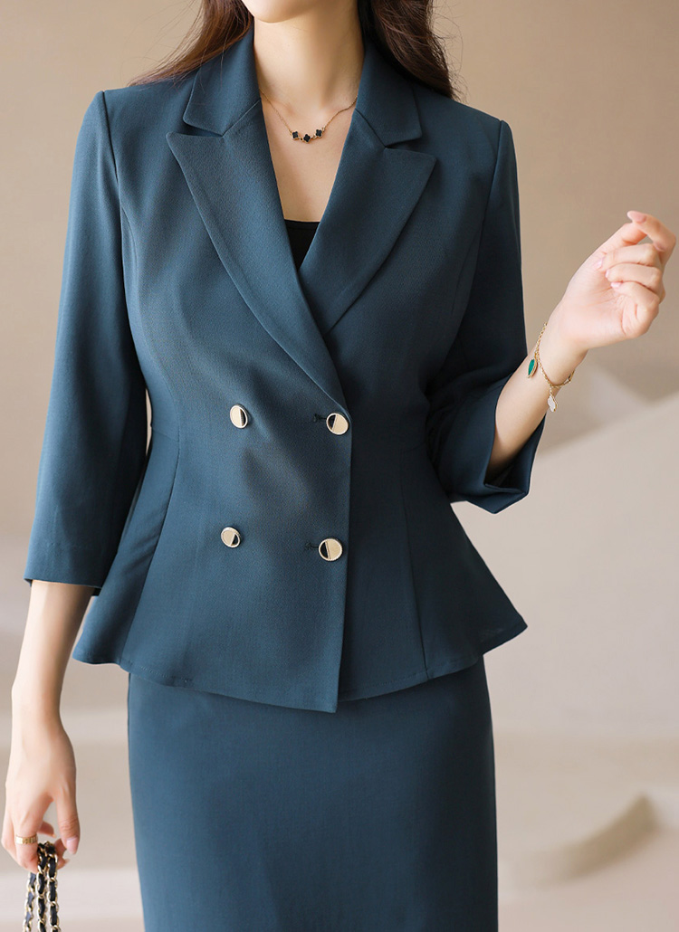 [Slim-fit blazer with gold-tone double buttons and a feminine peplum hem for an elegant silhouette and flattering proportions.]