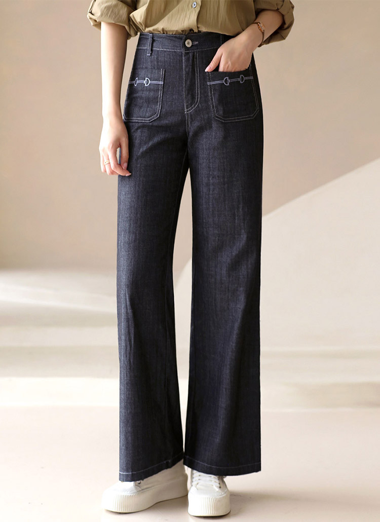 [Classic straight-fit jeans with chic pocket embroidery and back elastic waist, blending comfort with a sleek, elongated look.]