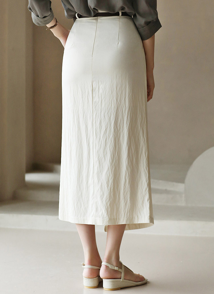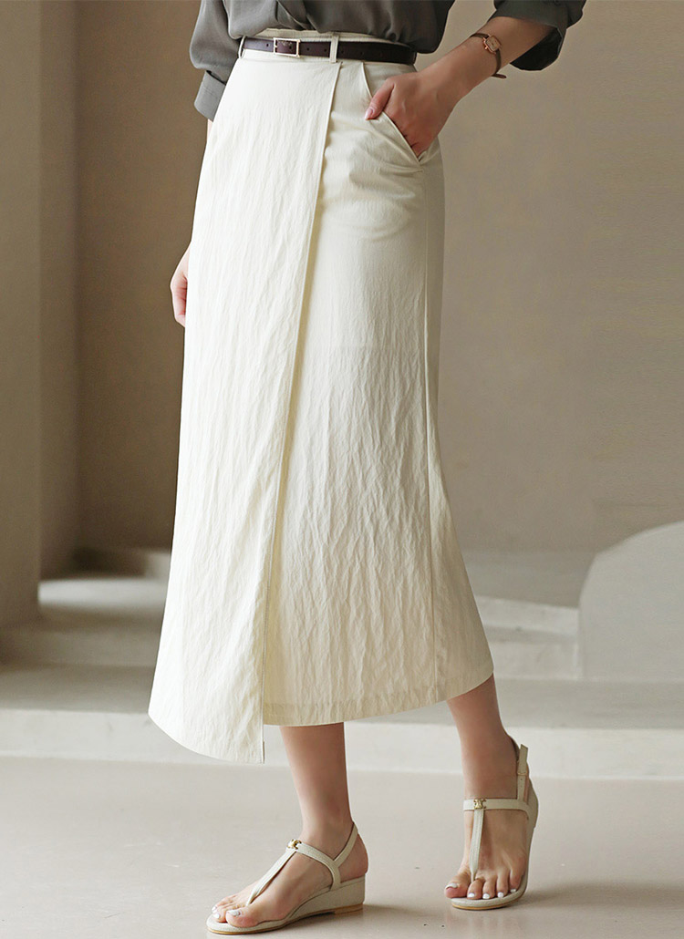 [Slim H-line silhouette skirt with a front wrap slit detail, crafted from a soft rayon-nylon blend for effortless style.]