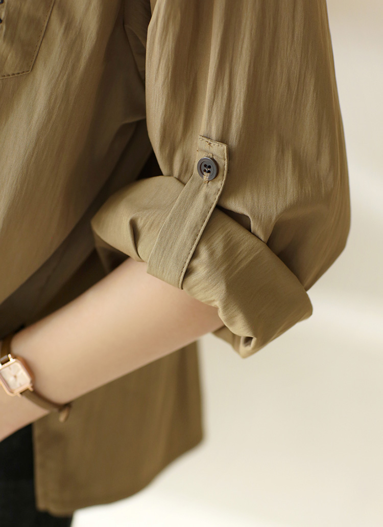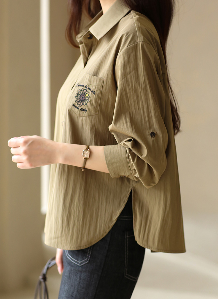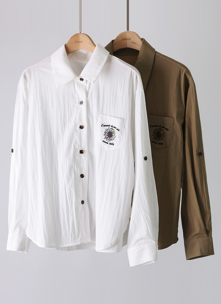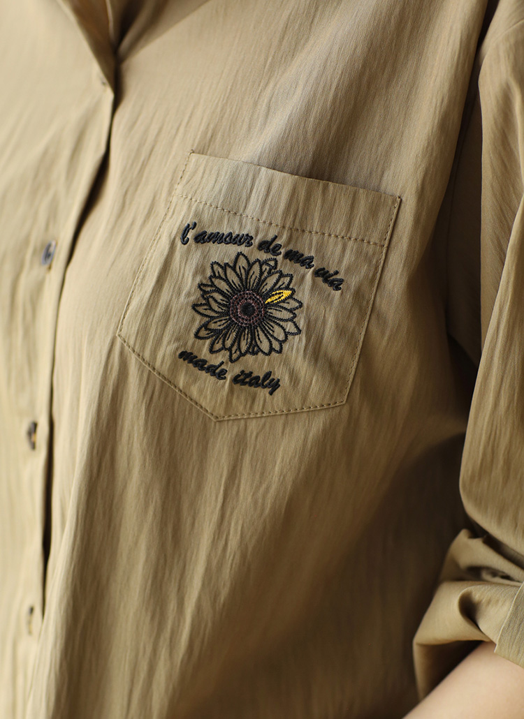 [Lightweight nylon-blend shirt with delicate floral embroidery and roll-up sleeves for versatile, stylish everyday wear.]