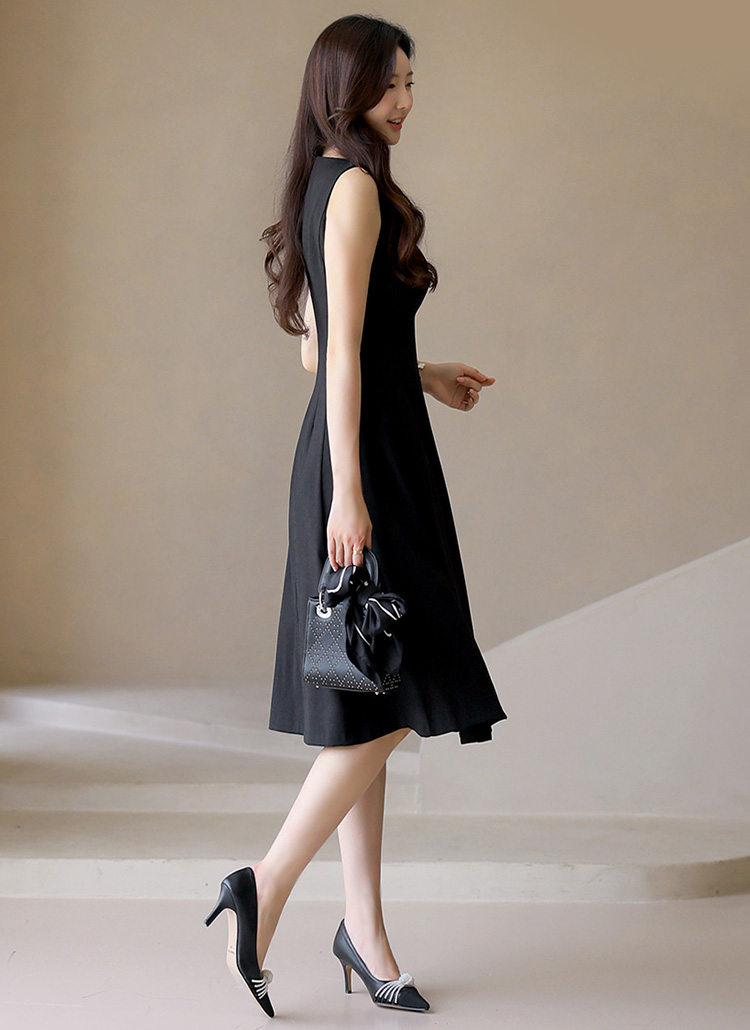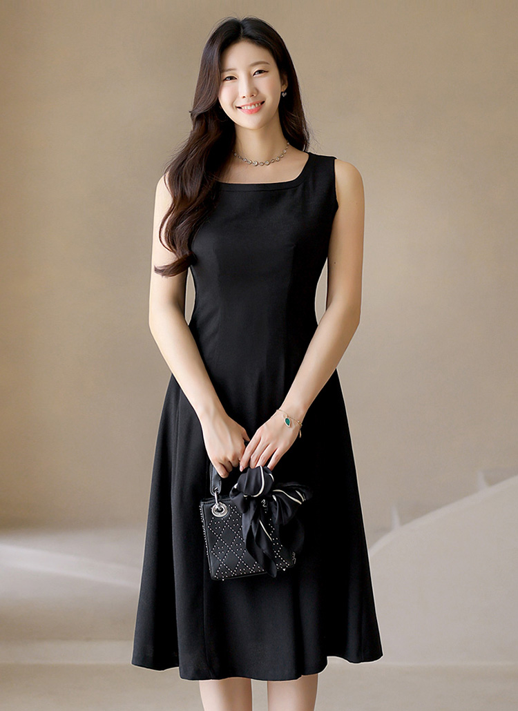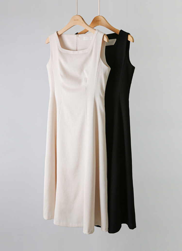 [With a clean square neck and gentle flare, this sleeveless midi dress offers elegance and ease—perfect for events, gatherings, or daily chic.]
