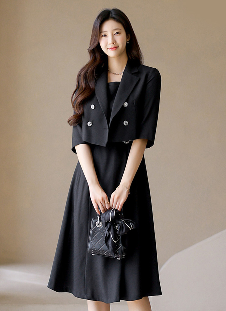 [A tailored collar and refined silver buttons bring timeless elegance to this cropped jacket—perfect for work or evening outings.]