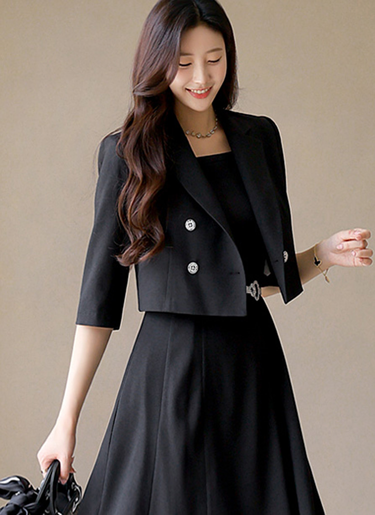 [A tailored collar and refined silver buttons bring timeless elegance to this cropped jacket—perfect for work or evening outings.]