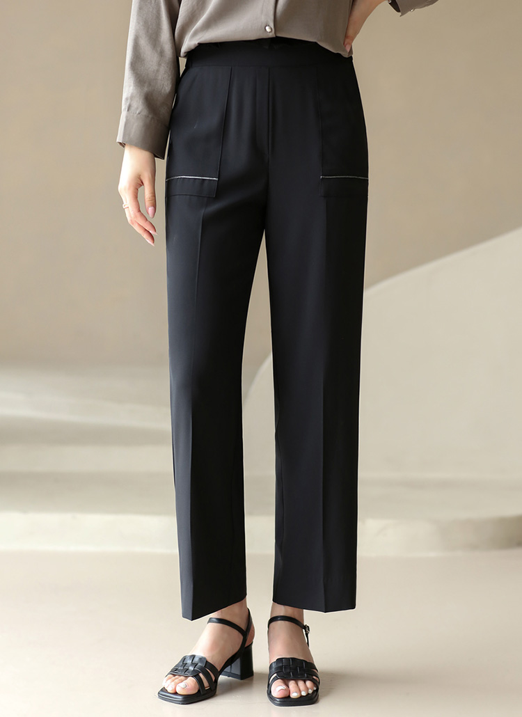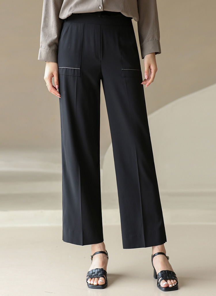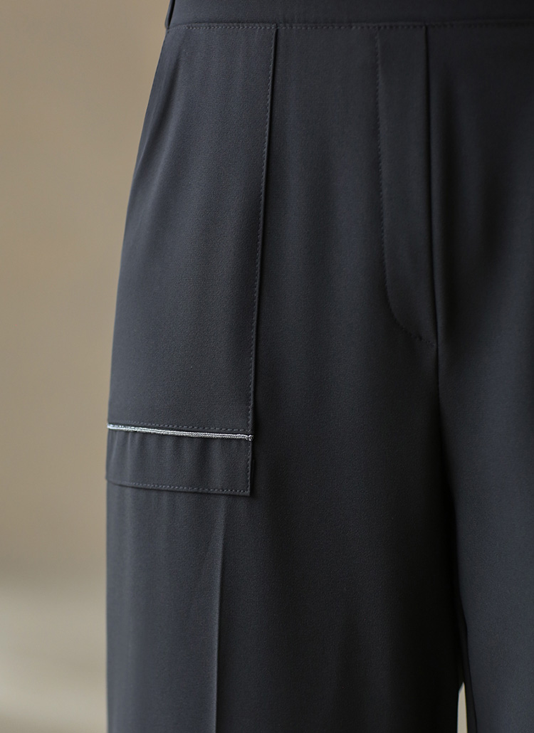 [Lightweight straight-fit slacks with subtle silver accents, back elastic, and side hem slits for a chic, modern look.]