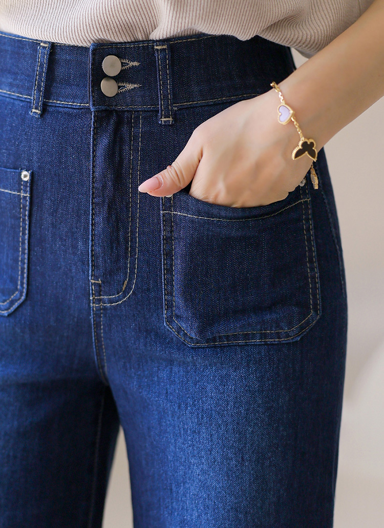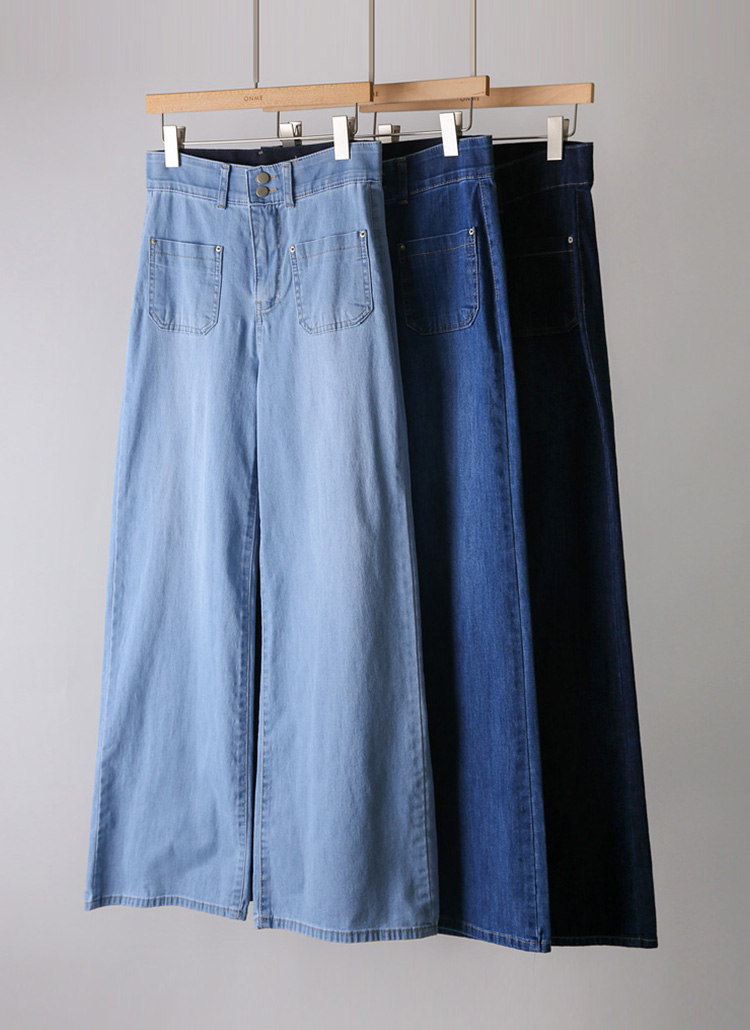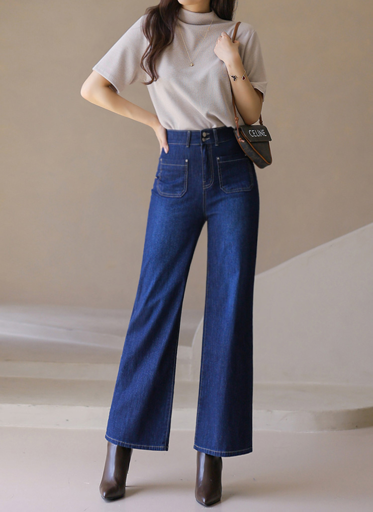 [Casual yet refined high-rise denim with straight wide fit, hidden stretch waistband, and out pocket accents for daily styling.]