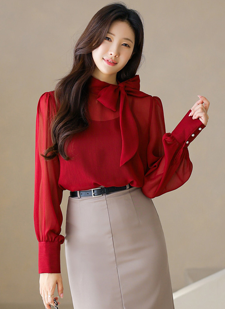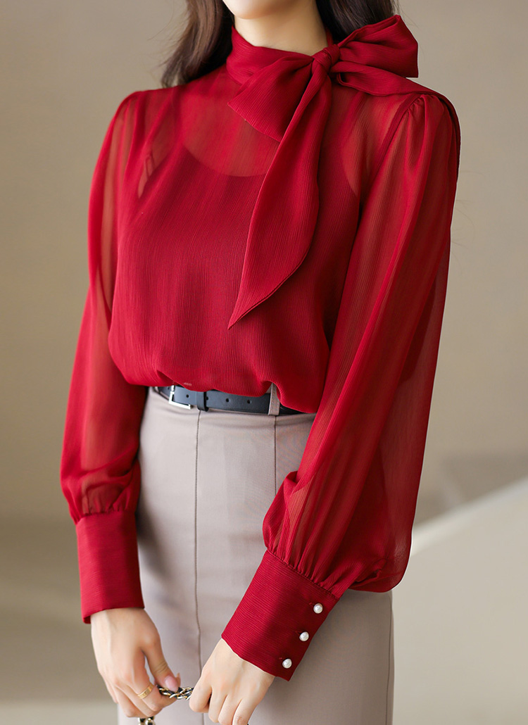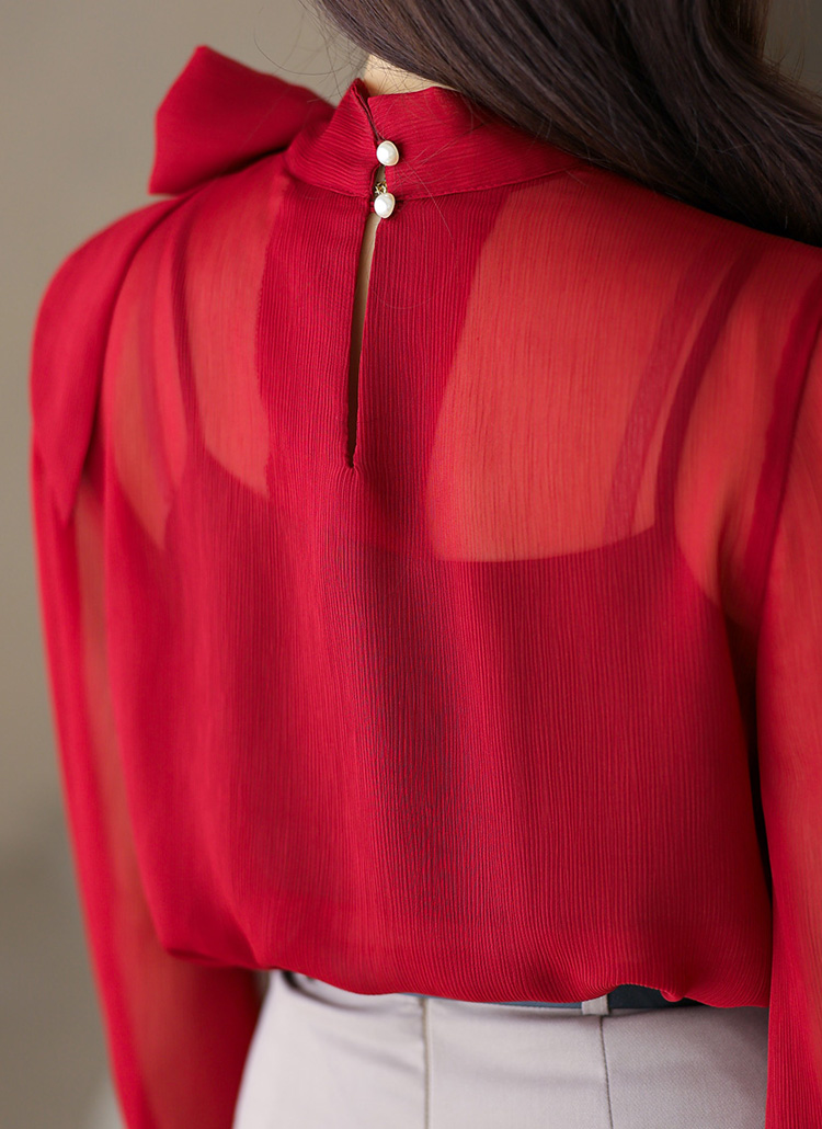 [A graceful sheer chiffon blouse with a flowing tie-neck and soft drape, offering feminine charm and versatile styling.]