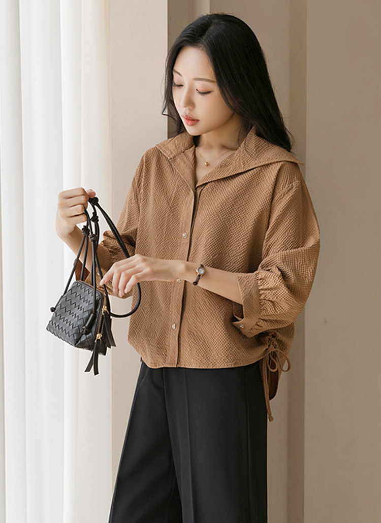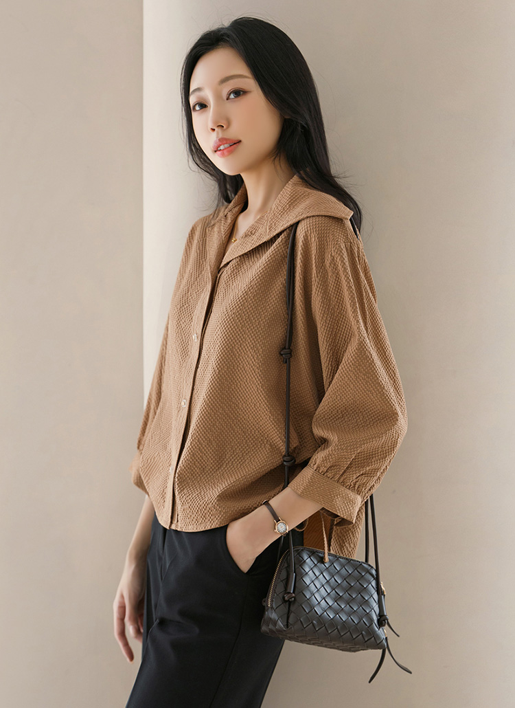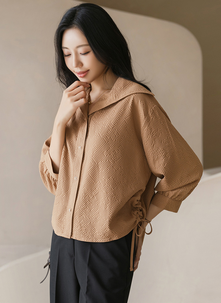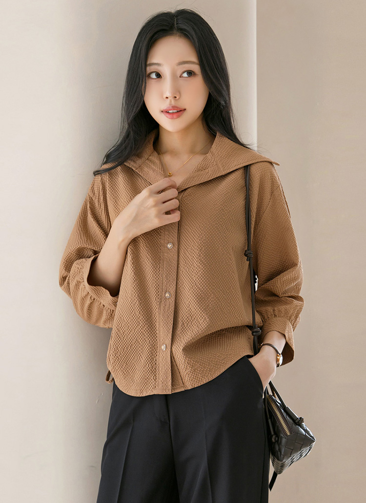 [A chic blouse in embossed fabric with a sailor collar, puff 3/4 sleeves, and drawstring sides for a feminine yet modern finish.]