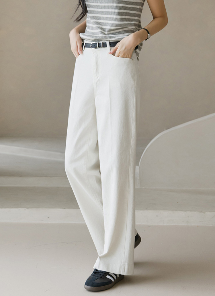 [Comfortable cotton blend pants with flattering wide fit. Clean leg line creates lengthening effect. Soft, stretchy fabric ensures all-day comfort.]
