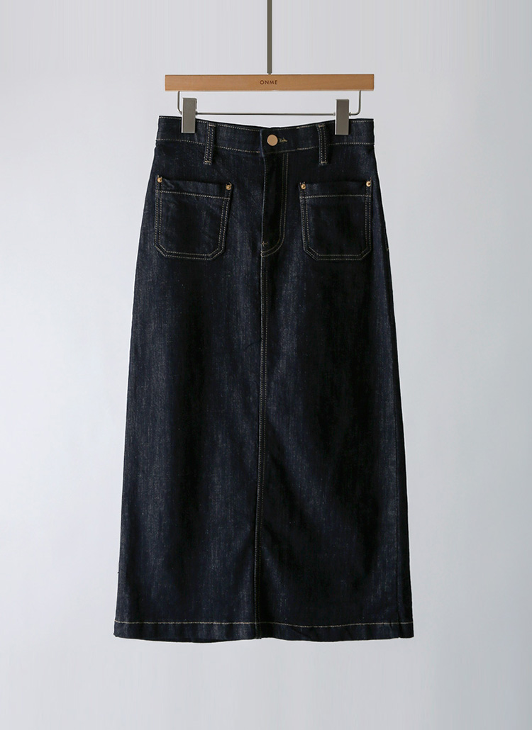 [Classic H-line denim skirt with contrast stitching details. Back slit for easy movement. Timeless dark wash pairs with any style effortlessly.]