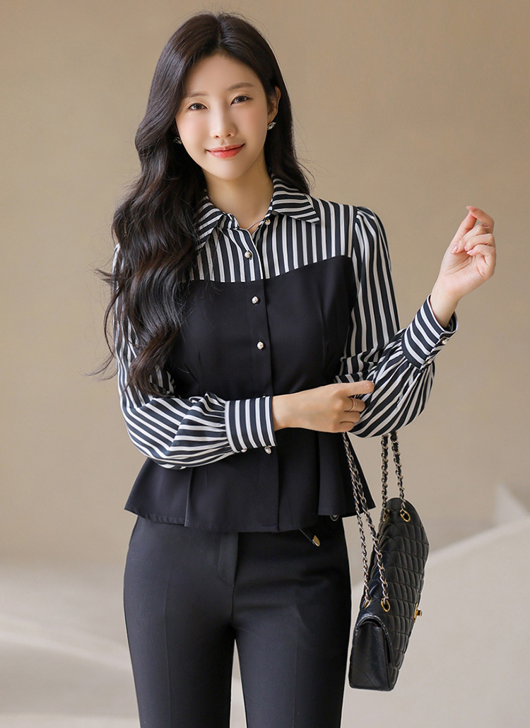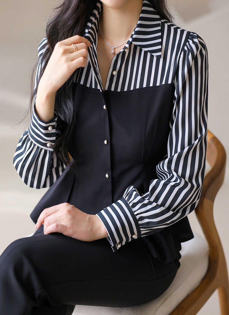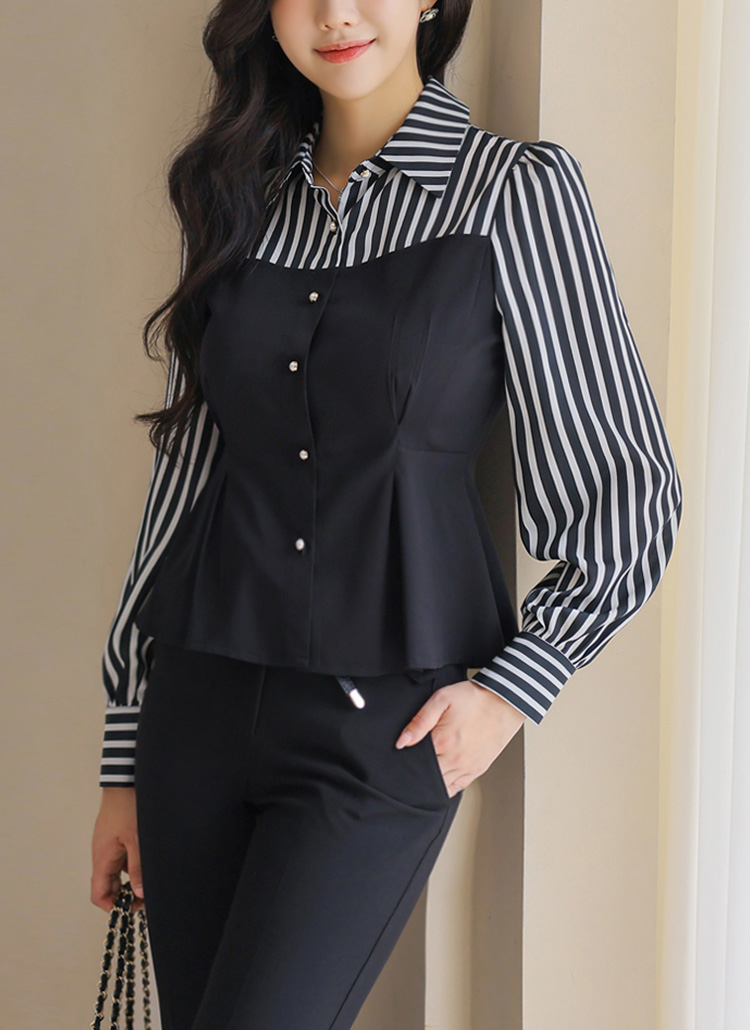 [A layered bustier-style blouse with chic stripes and a peplum waistline that flatters the silhouette with elegance.]