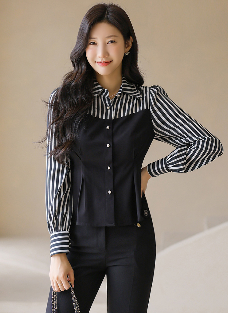스트라이프 패턴과 카라 디자인이 만나 모던하고 세련된 무드를 연출하는