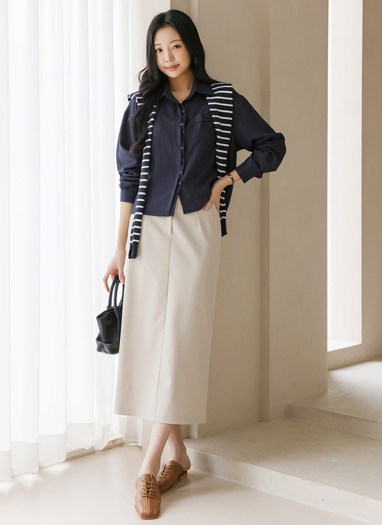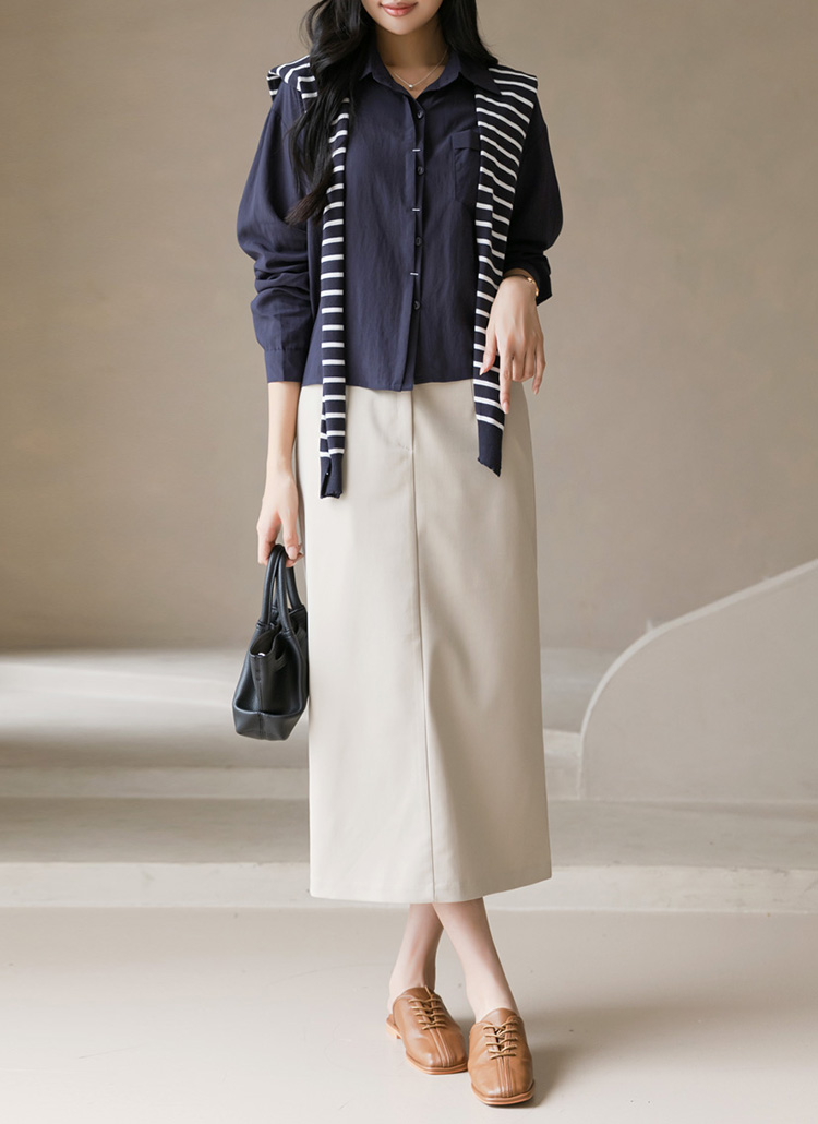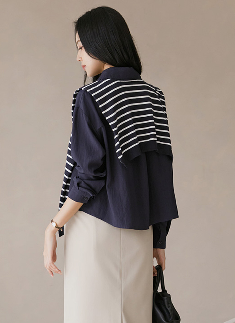 [Casual yet refined, this set combines a relaxed shirt and striped knit shawl, offering effortless style from workdays to weekends.]