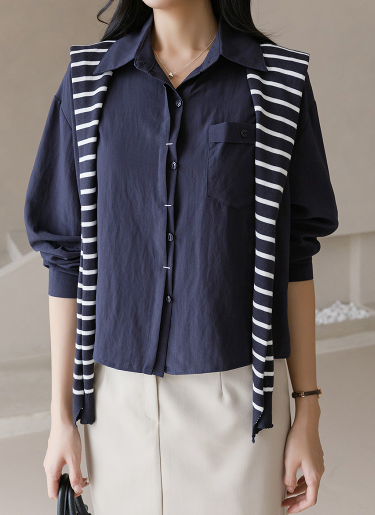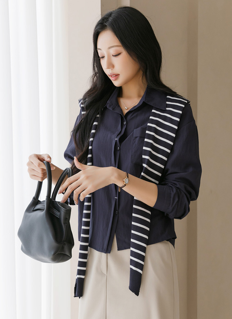[The Onme] Detachable Stripe Shawl with Button Detail Shirt SET