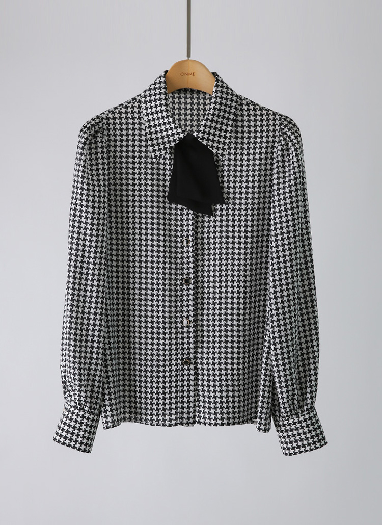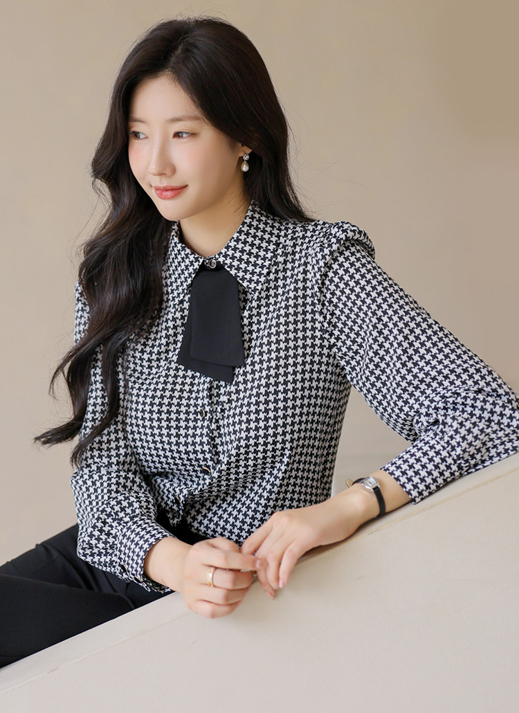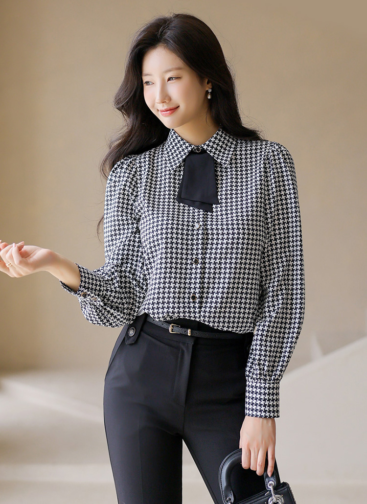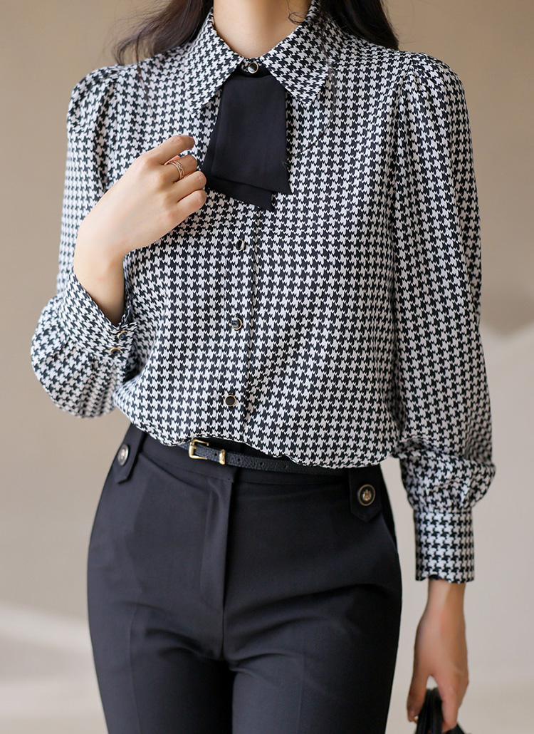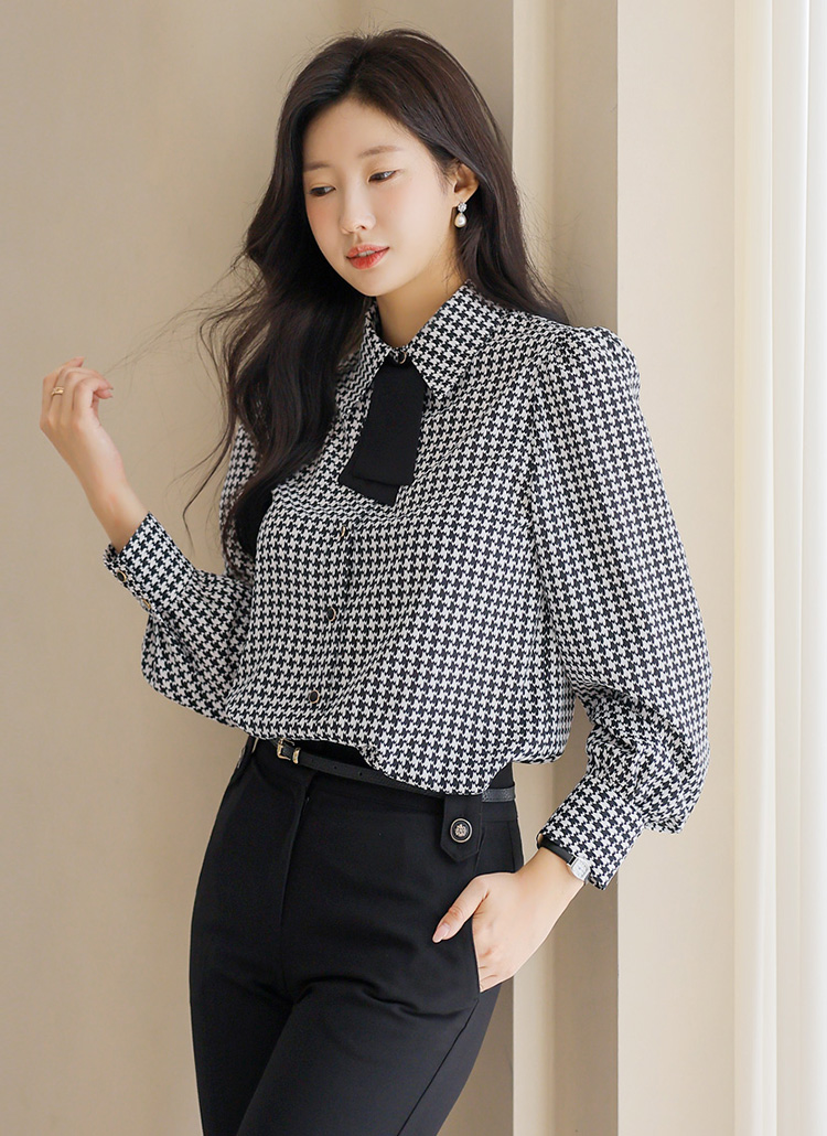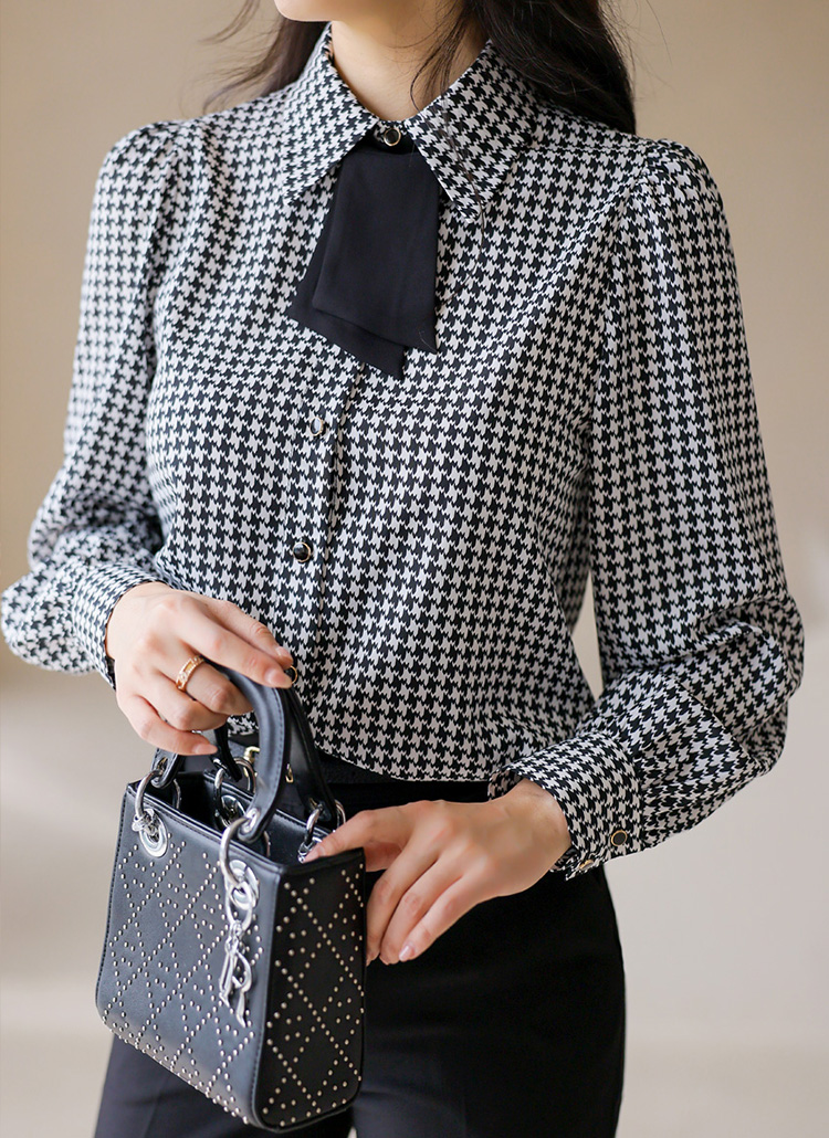 [LouisAngel] Sophisticated Houndstooth Tie Blouse