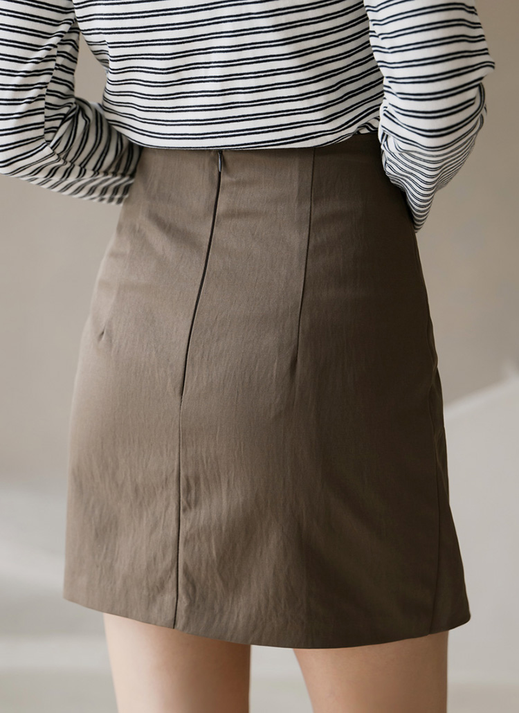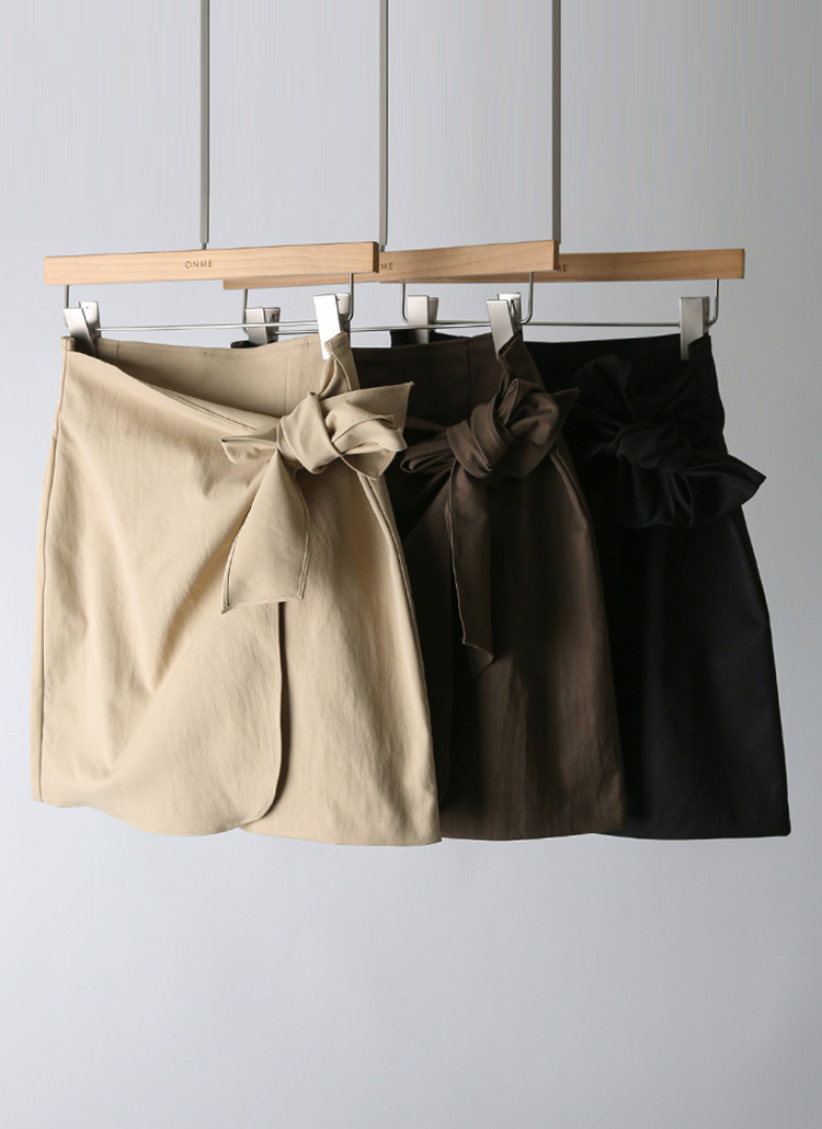 [A stylish wrap mini skirt with twisted tie detail, designed to elongate the legs with a slim H-line fit and versatile feminine charm.]