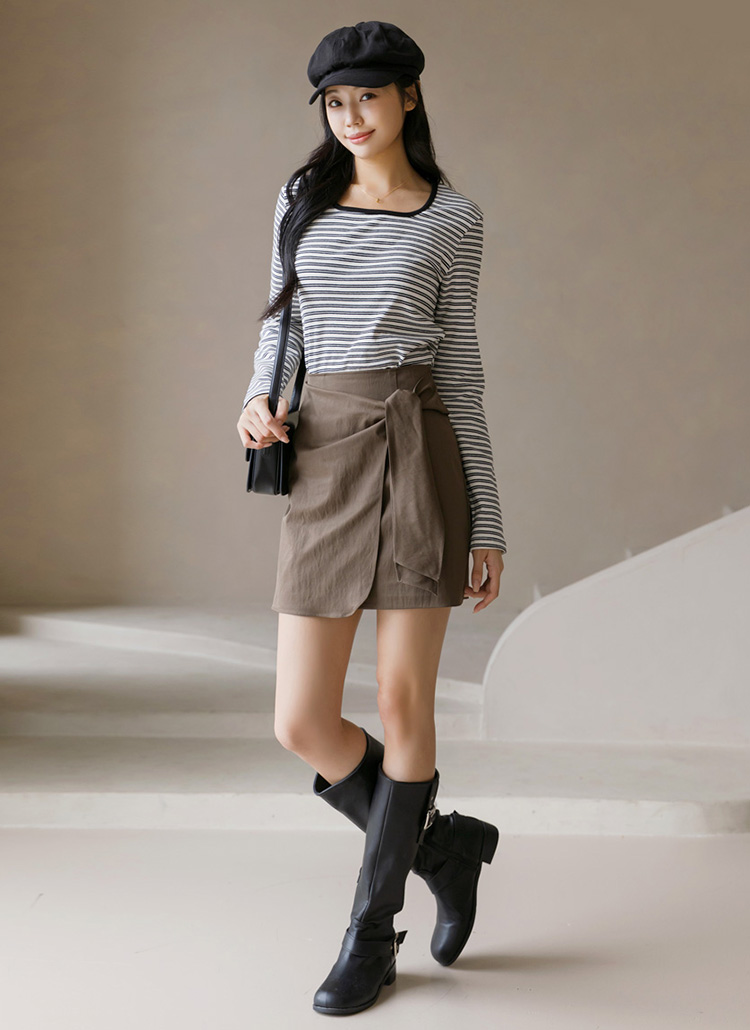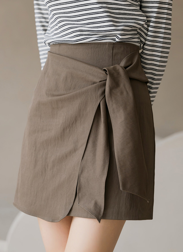 [A stylish wrap mini skirt with twisted tie detail, designed to elongate the legs with a slim H-line fit and versatile feminine charm.]