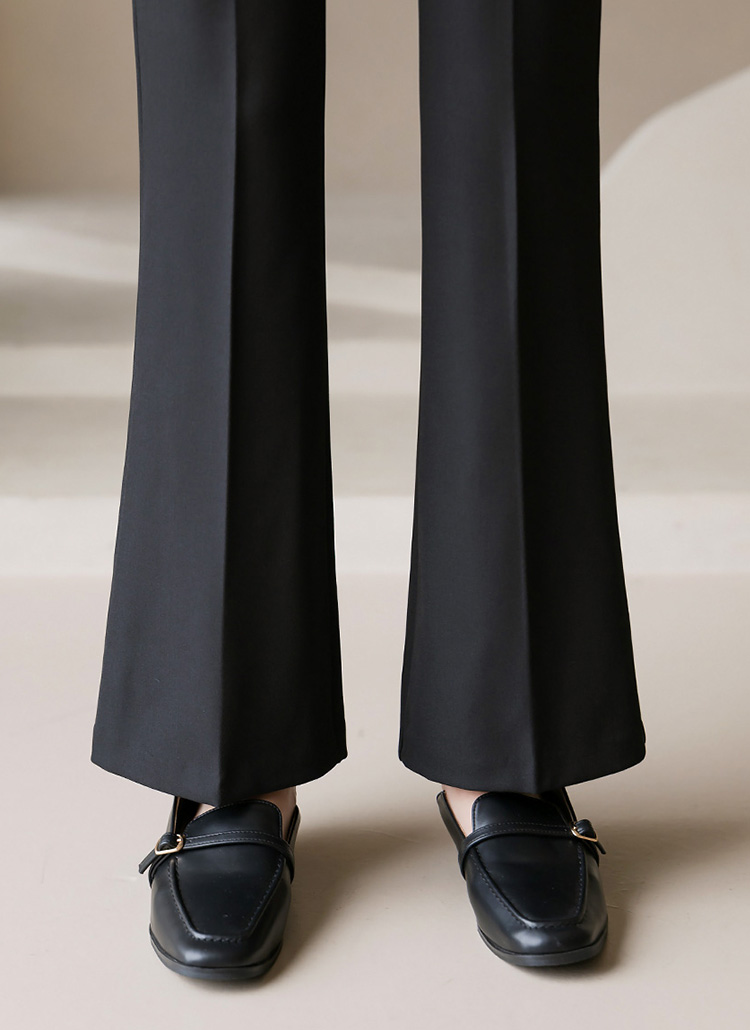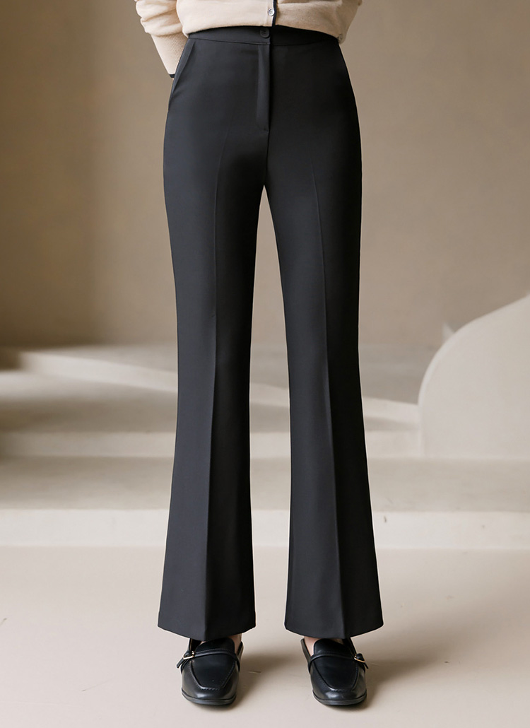 [Tailored with a front crease, these boot-cut slacks elongate the legs with a clean silhouette and stretch comfort for daily or office looks.]