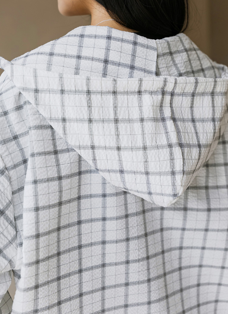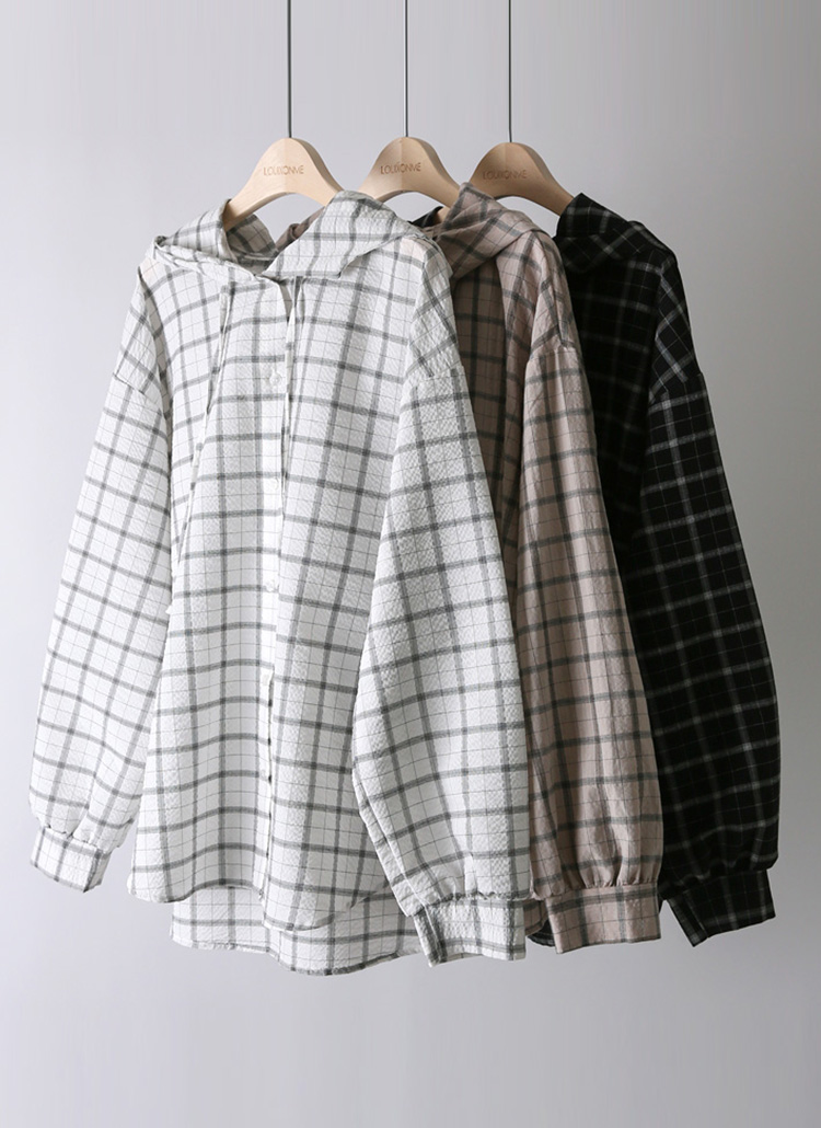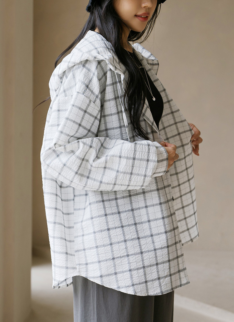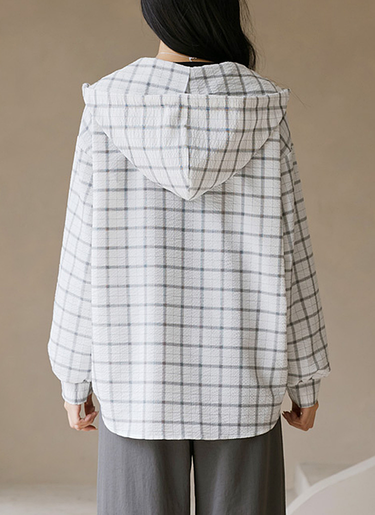 [Casual plaid hooded shirt in soft cotton with a lightweight feel, oversized fit, and puff sleeve detail for feminine yet relaxed style.]