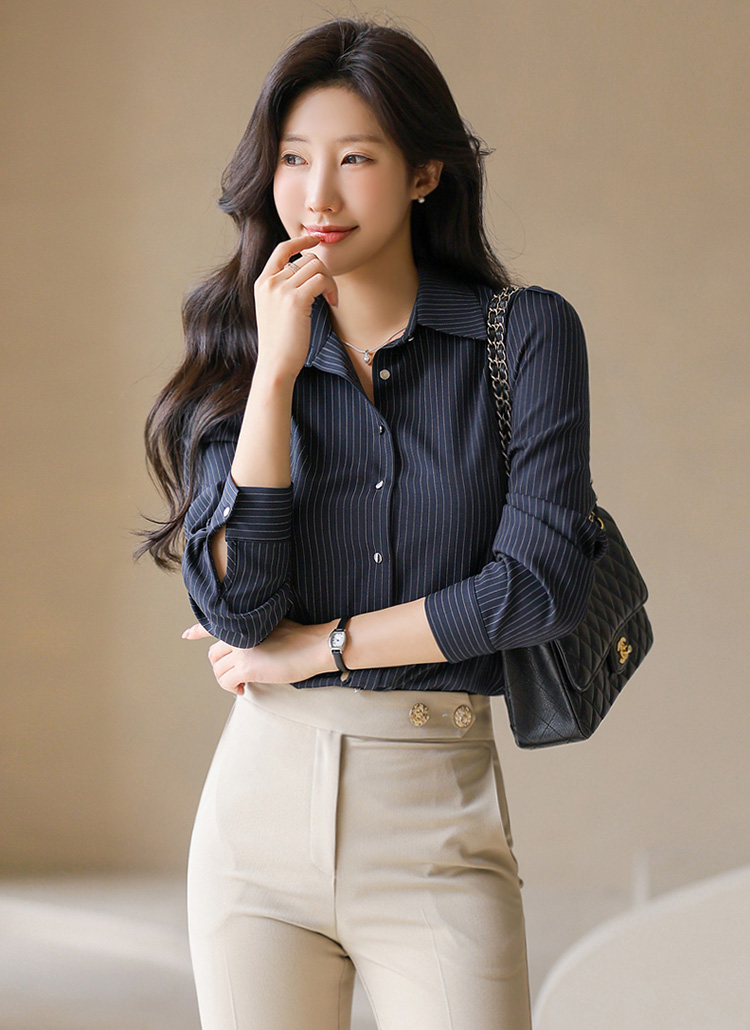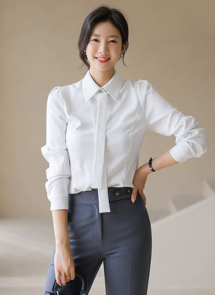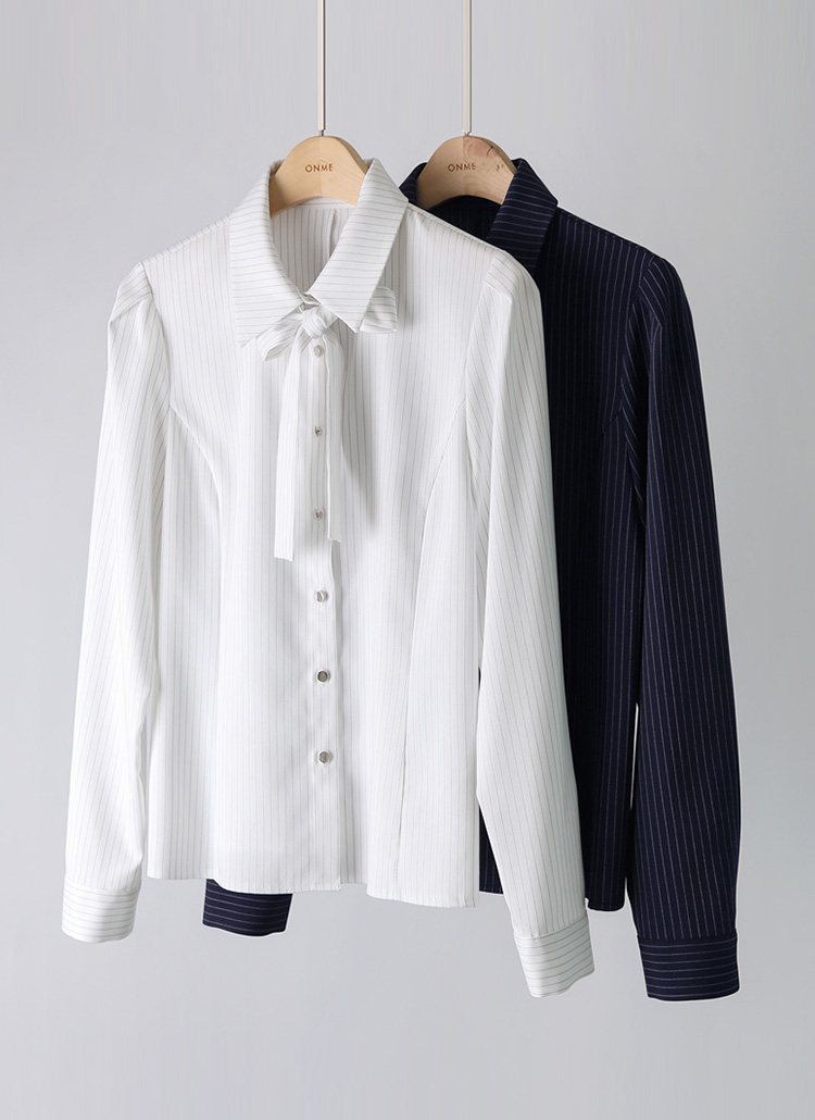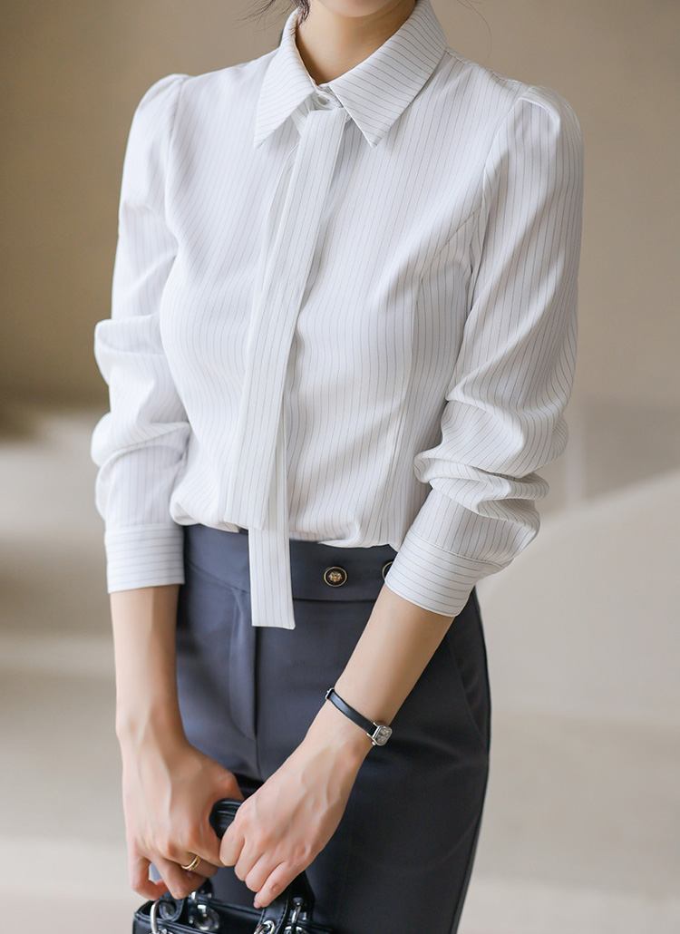 [Designed with princess seams for a flattering fit, this slim pinstripe blouse comes with a detachable ribbon tie for smart layering.]