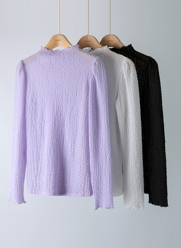 [Delicate mock neck top crafted with embossed texture. Airy sheer fabric offers comfort, perfect for layering or solo styling.]