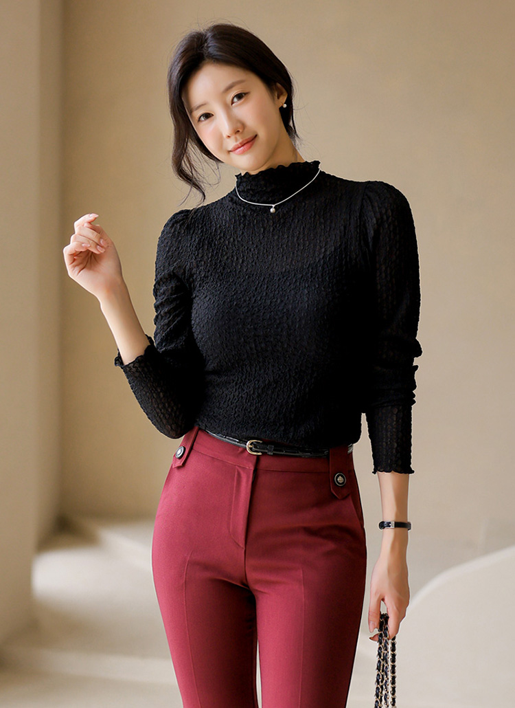 [LouisAngel] Embossed Sheer Mock Neck Blouse Tee