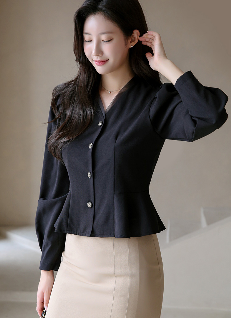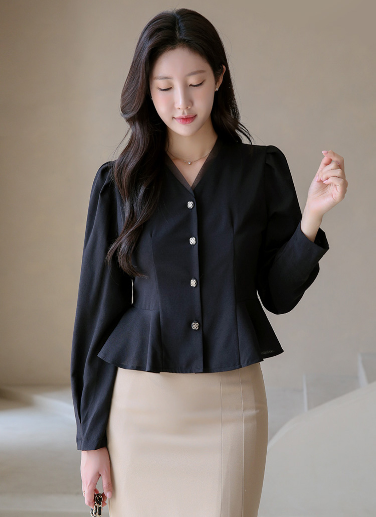 [This chic blouse highlights a slim waist with peplum design, puff sleeves, and sheer trim for a graceful, refined look.]