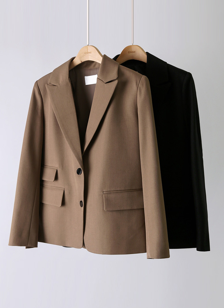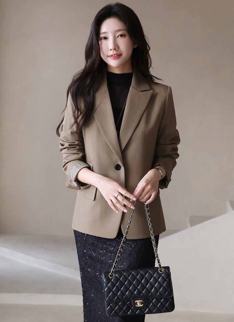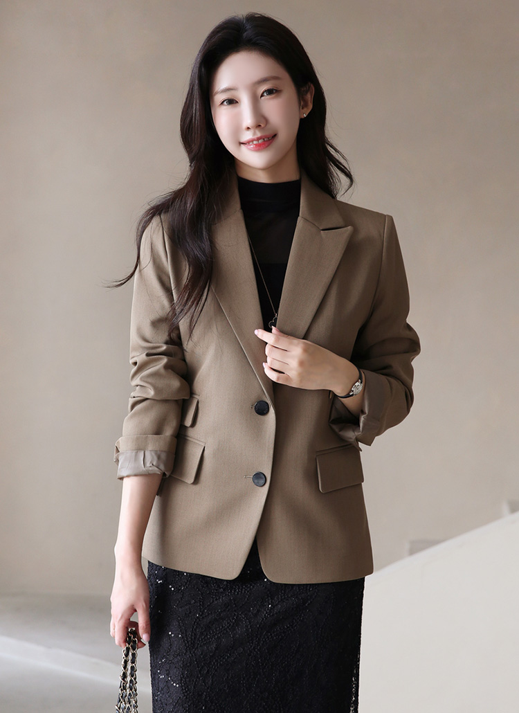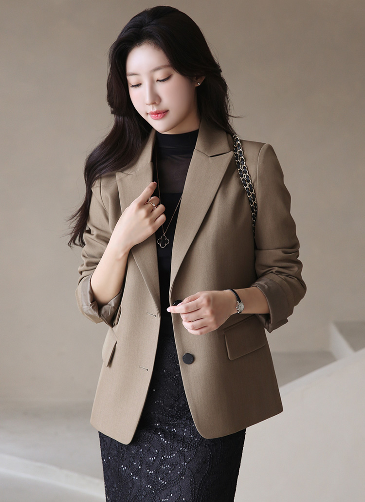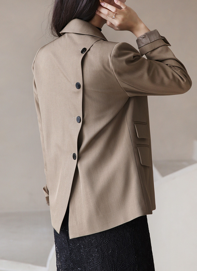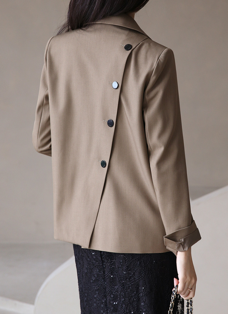 [Chic blazer with diagonal back buttons and a subtle slit detail, offering a modern twist to a classic tailored silhouette.]