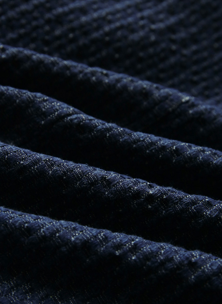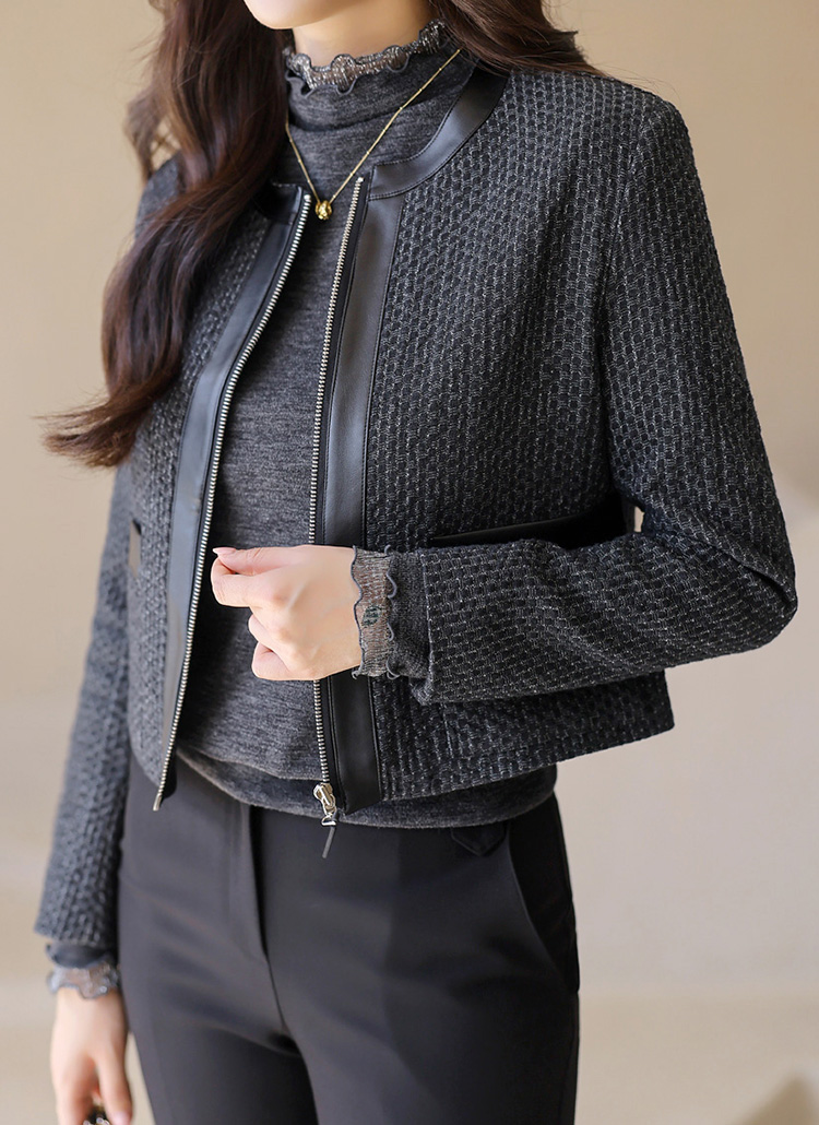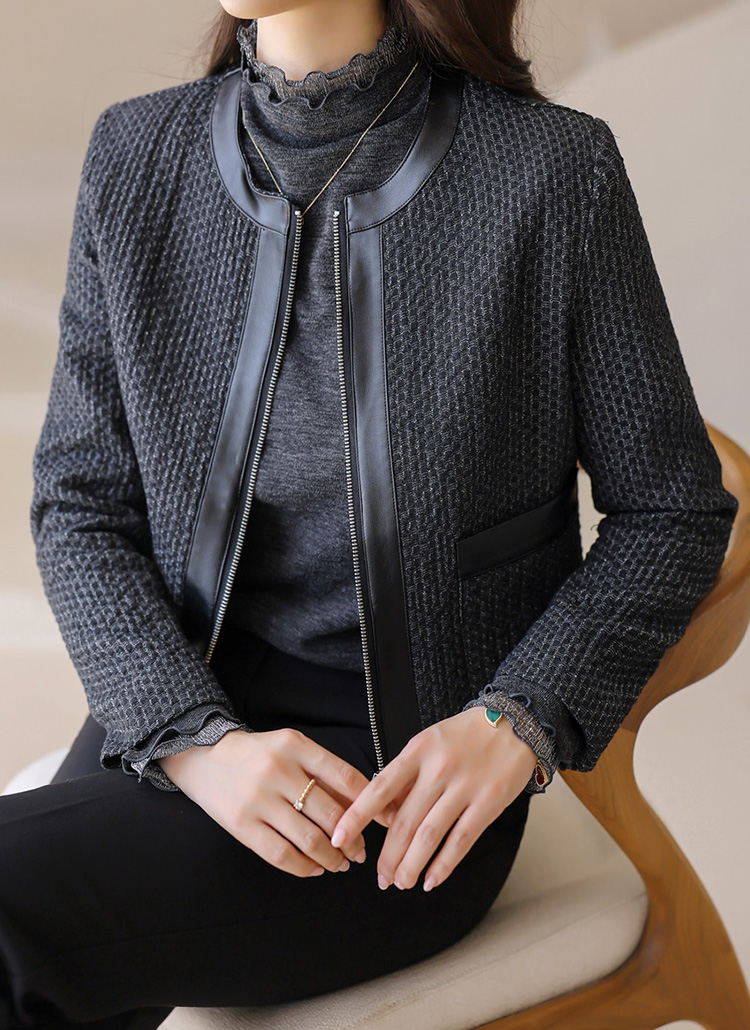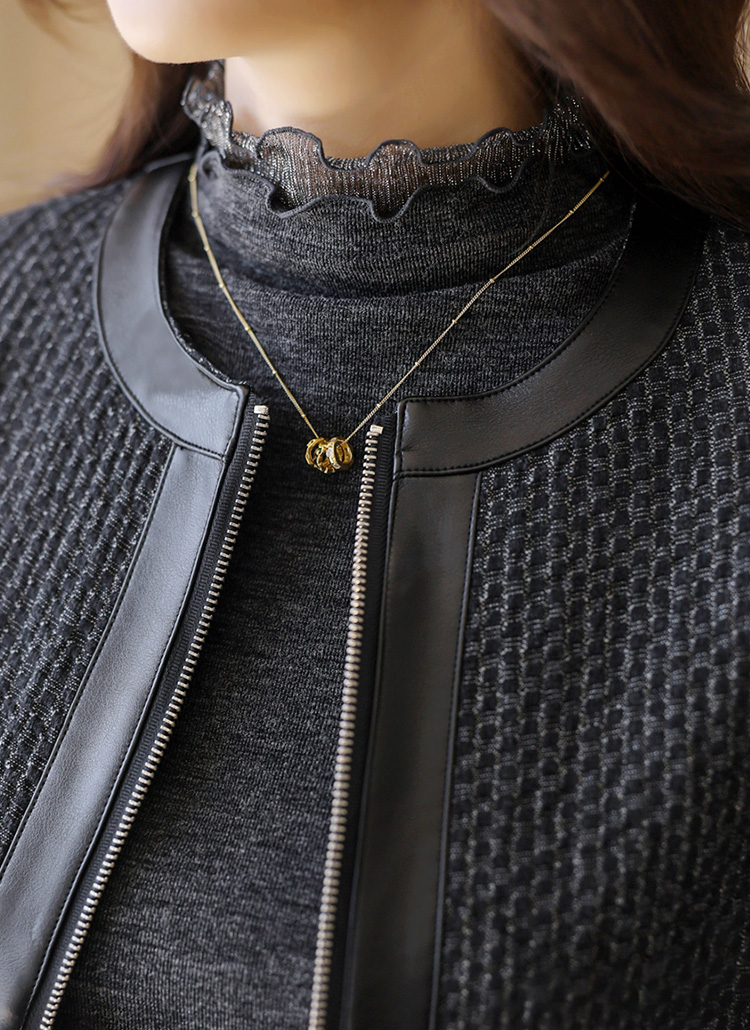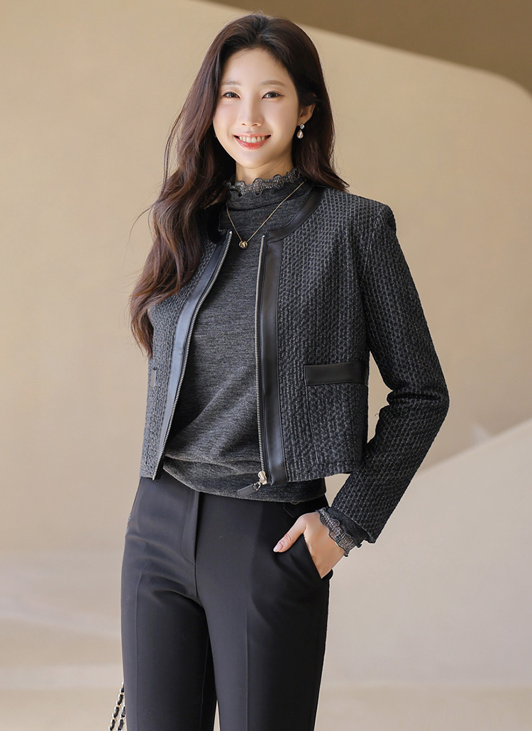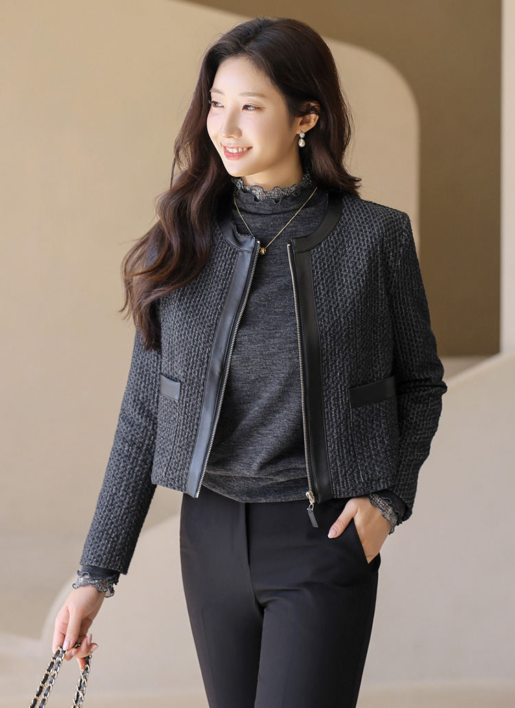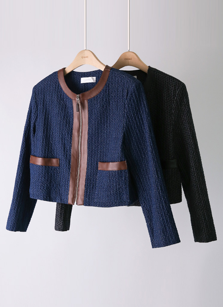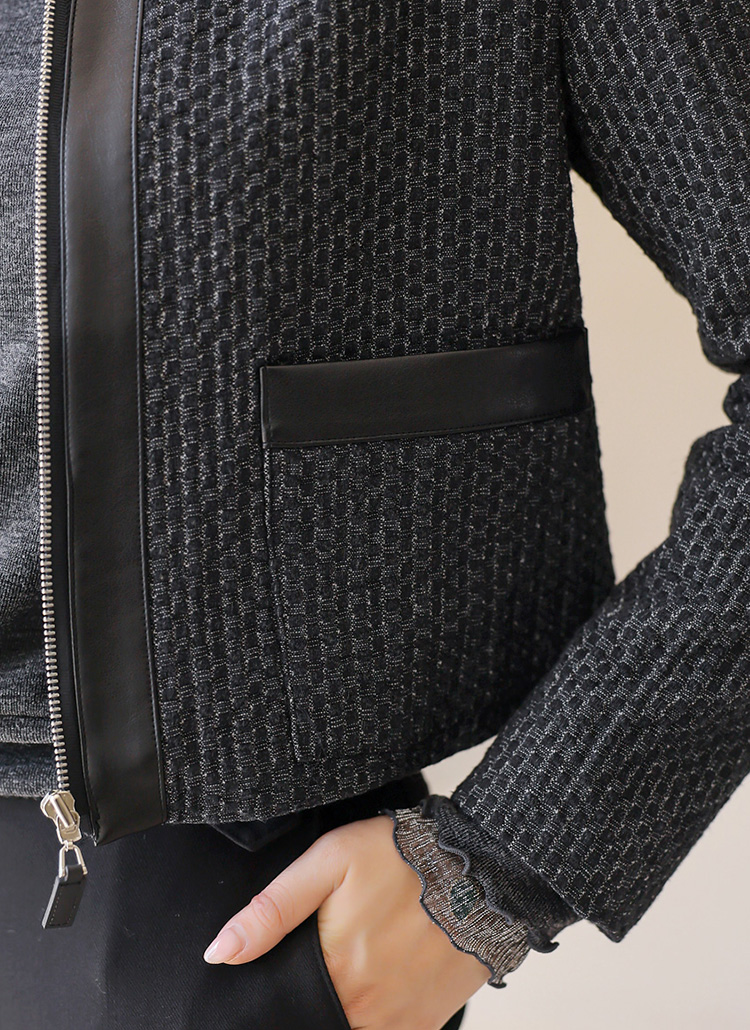 [Textured jacquard zip-up jacket with sleek eco-leather trim and semi-cropped fit, blending chic edge with versatile layering.]