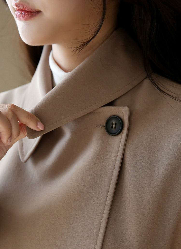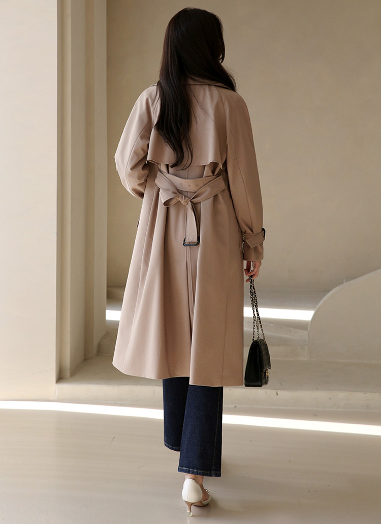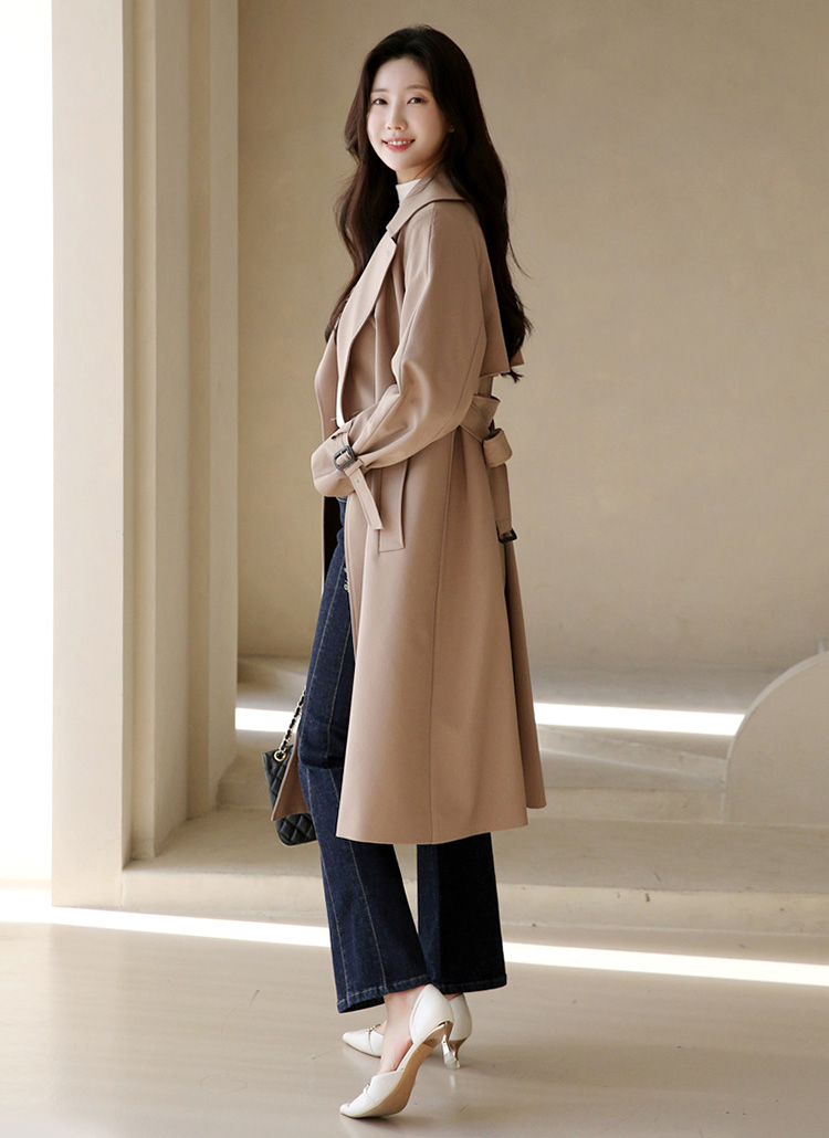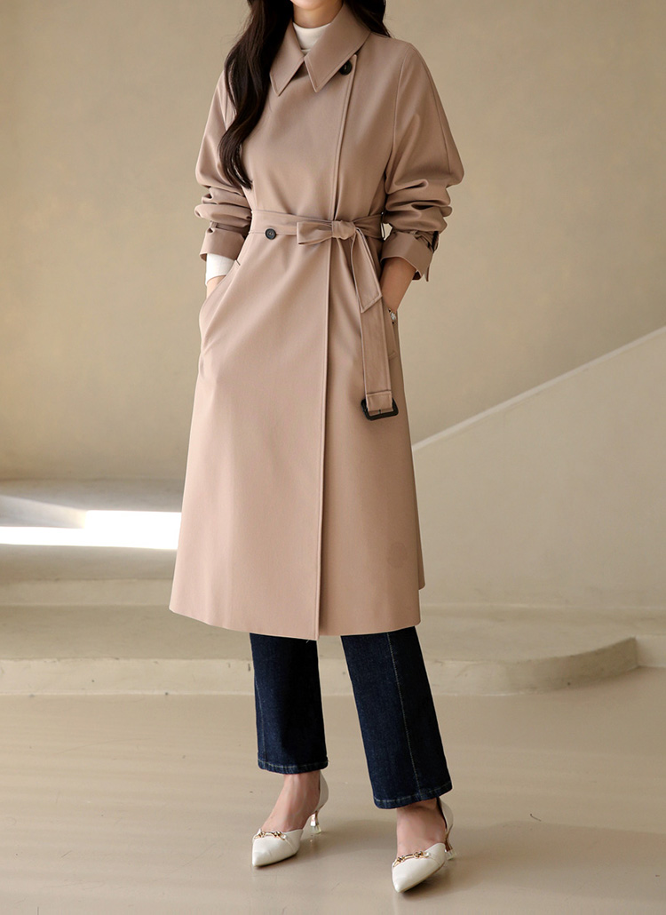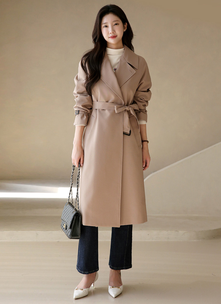 [Designed with a belted waist, sleeve straps, and back slit, this coat delivers modern elegance and everyday practicality in one.]