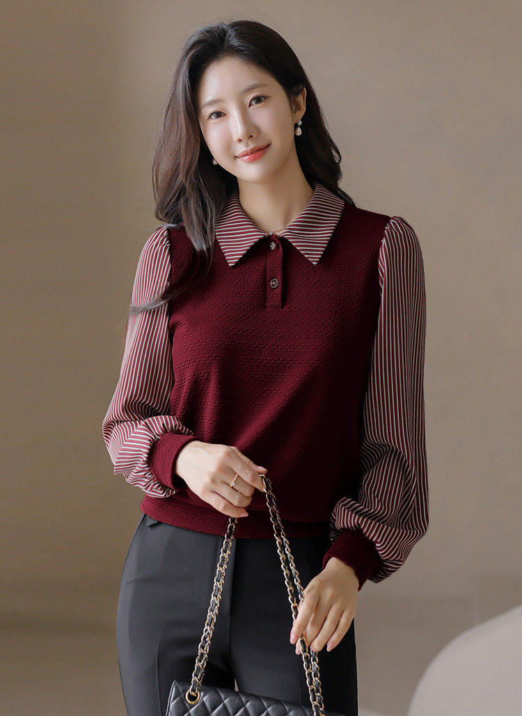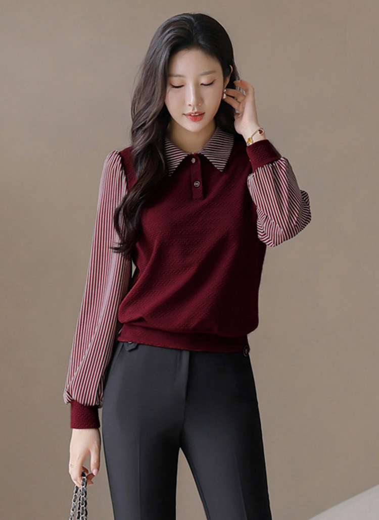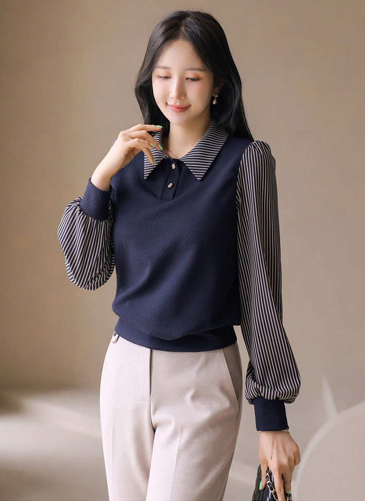 [LouisAngel] Striped Collar Contrast Blouse Tee