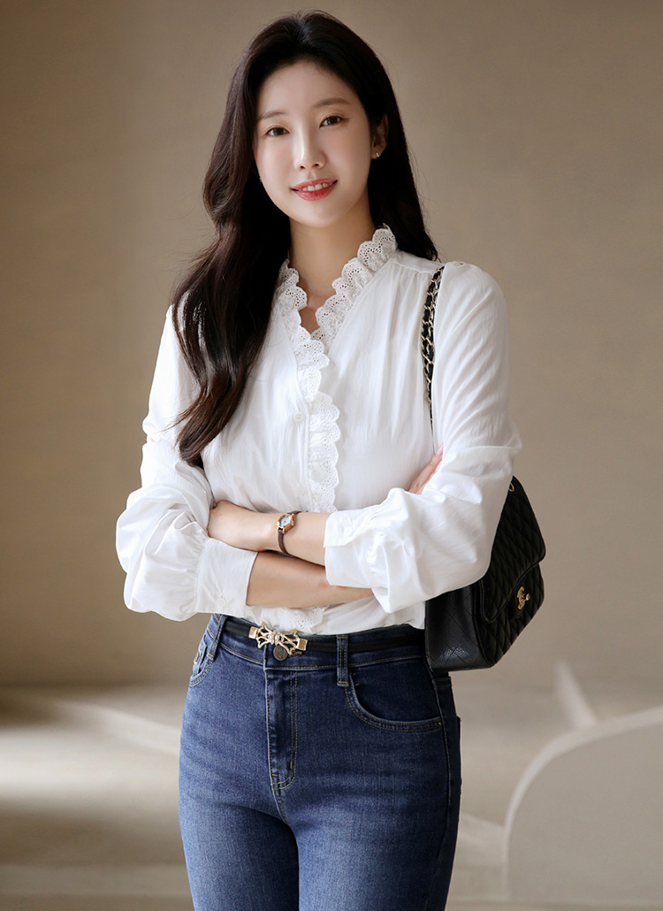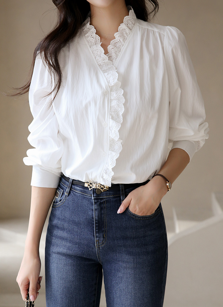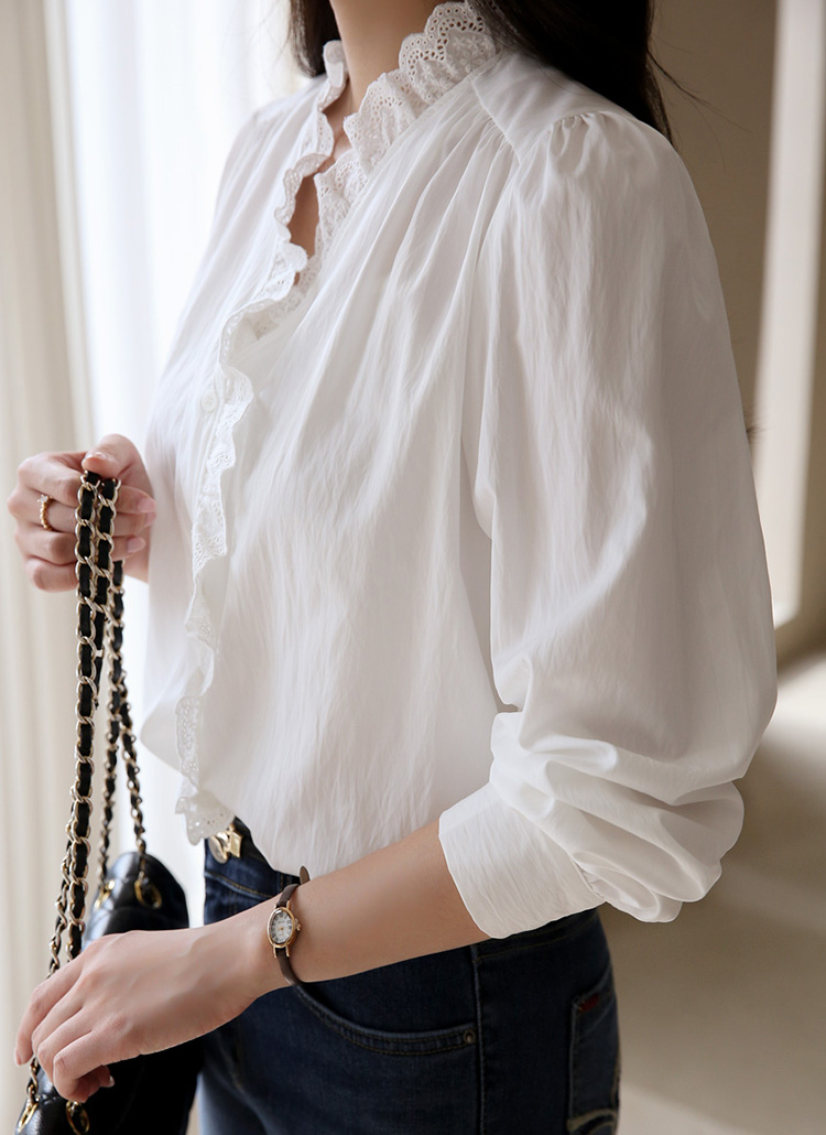 [Soft blouse detailed with lace-trimmed ruffles, shoulder shirring, and puff sleeves that add volume and romantic sophistication.]