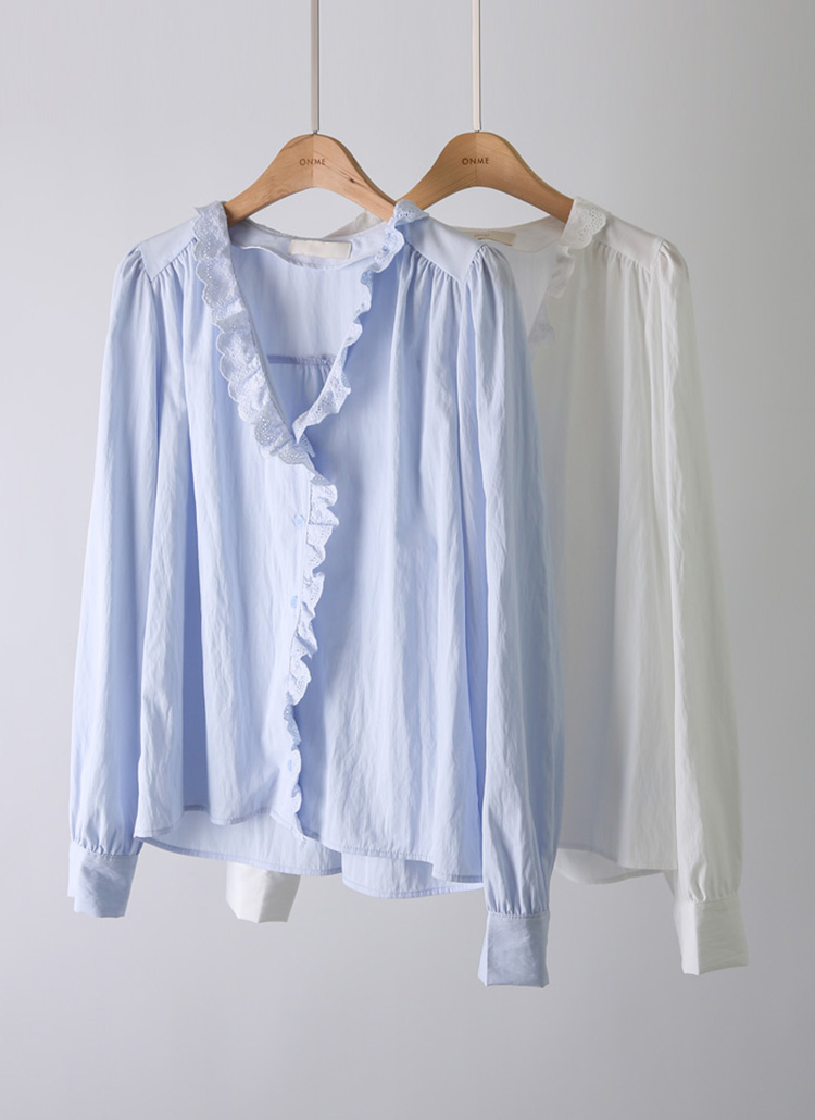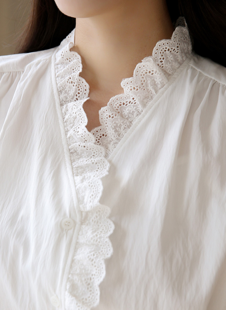 러플 레이스 디테일이 넥라인과 버튼라인을 따라 장식되어
