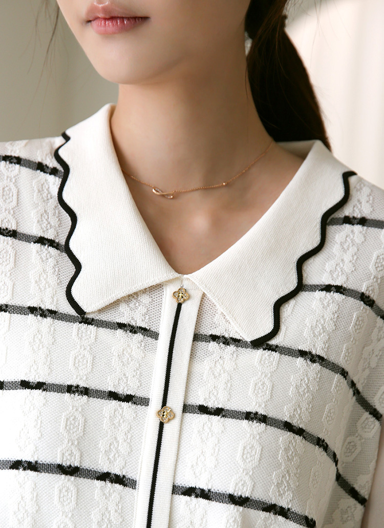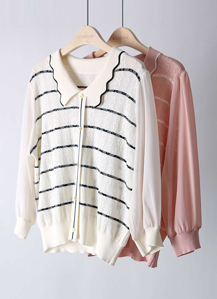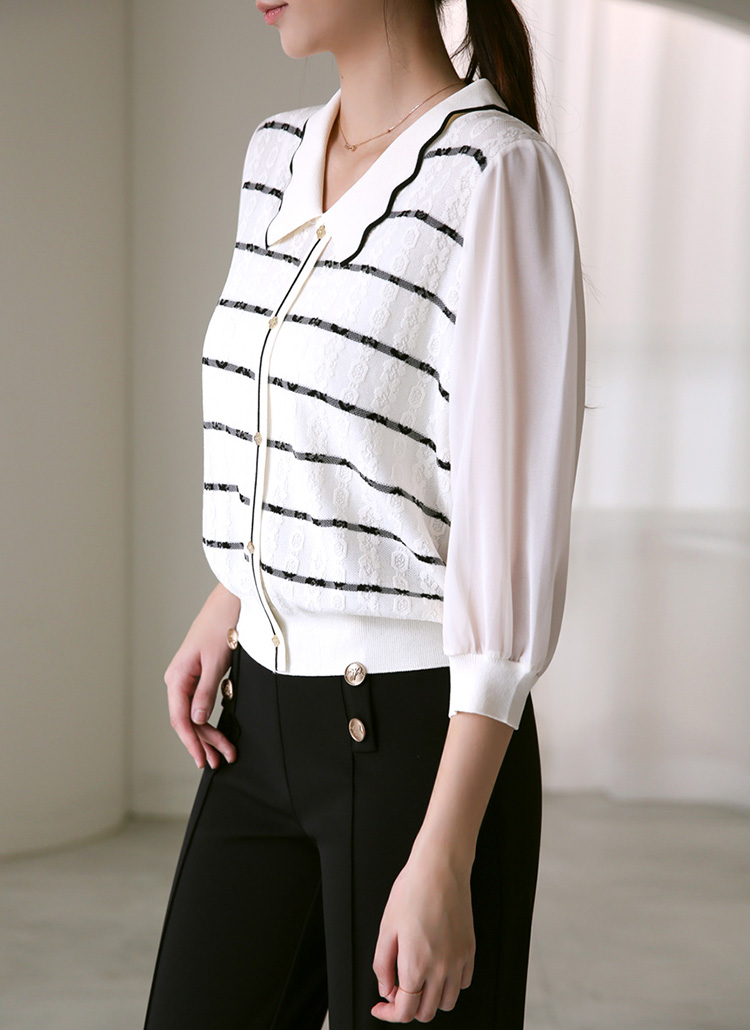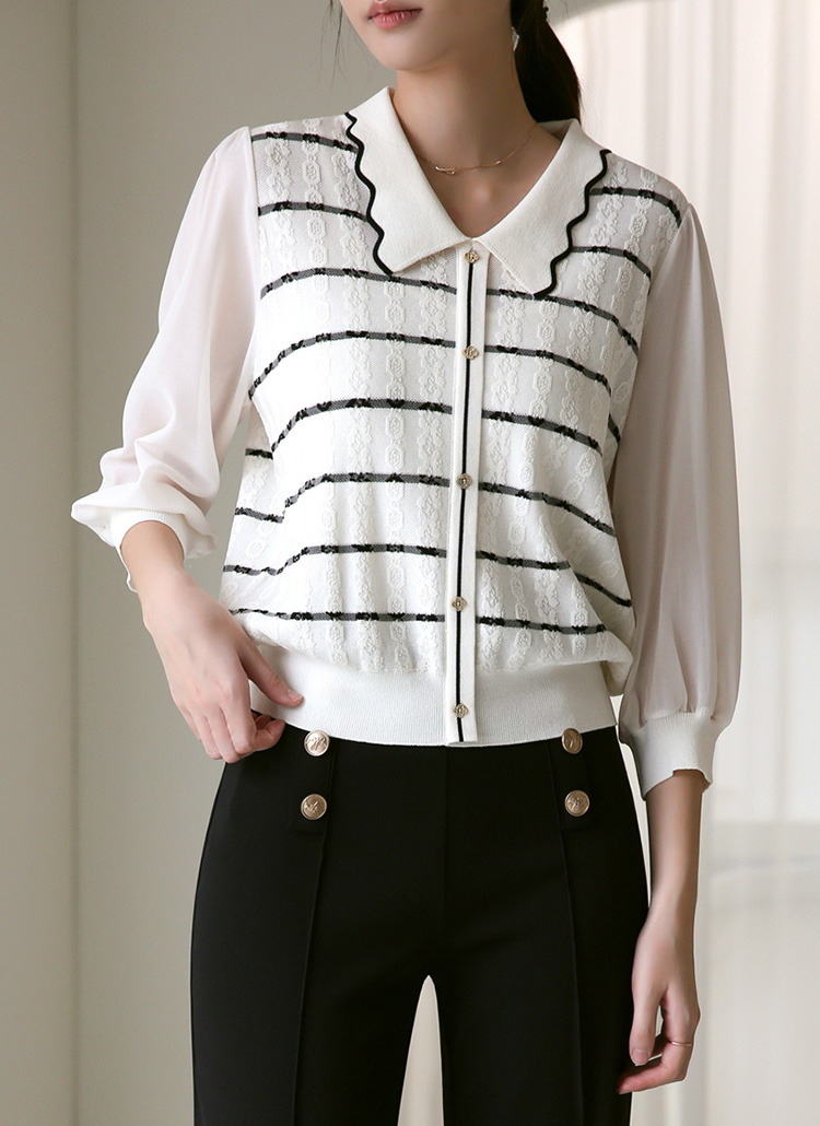 [Feminine knit blouse with sheer 3/4 chiffon sleeves and wave collar, elevated by textured jacquard stripes for chic elegance.]