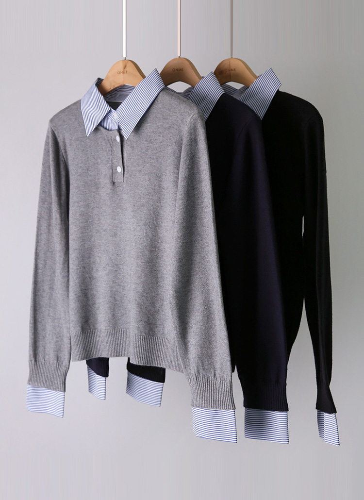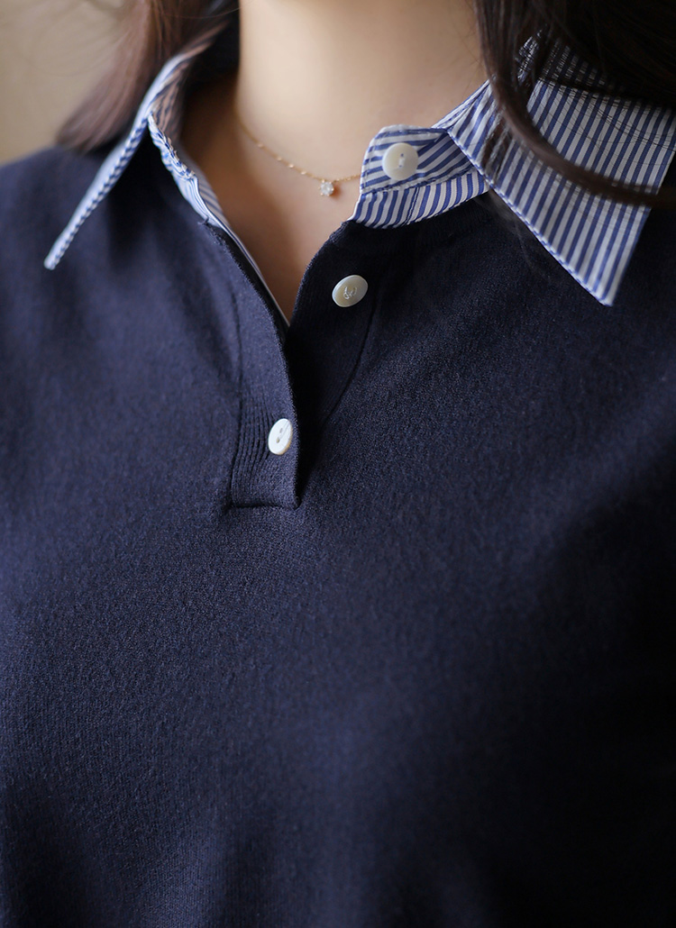 [Chic knit with striped shirt collar and cuffs, offering a layered look. Soft stretch fabric ensures comfort and everyday elegance.]